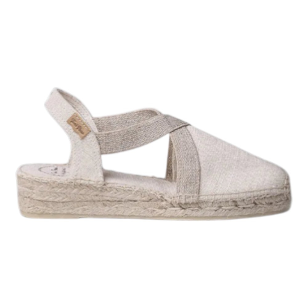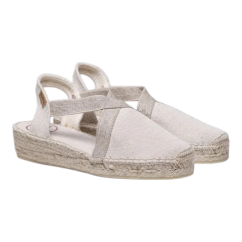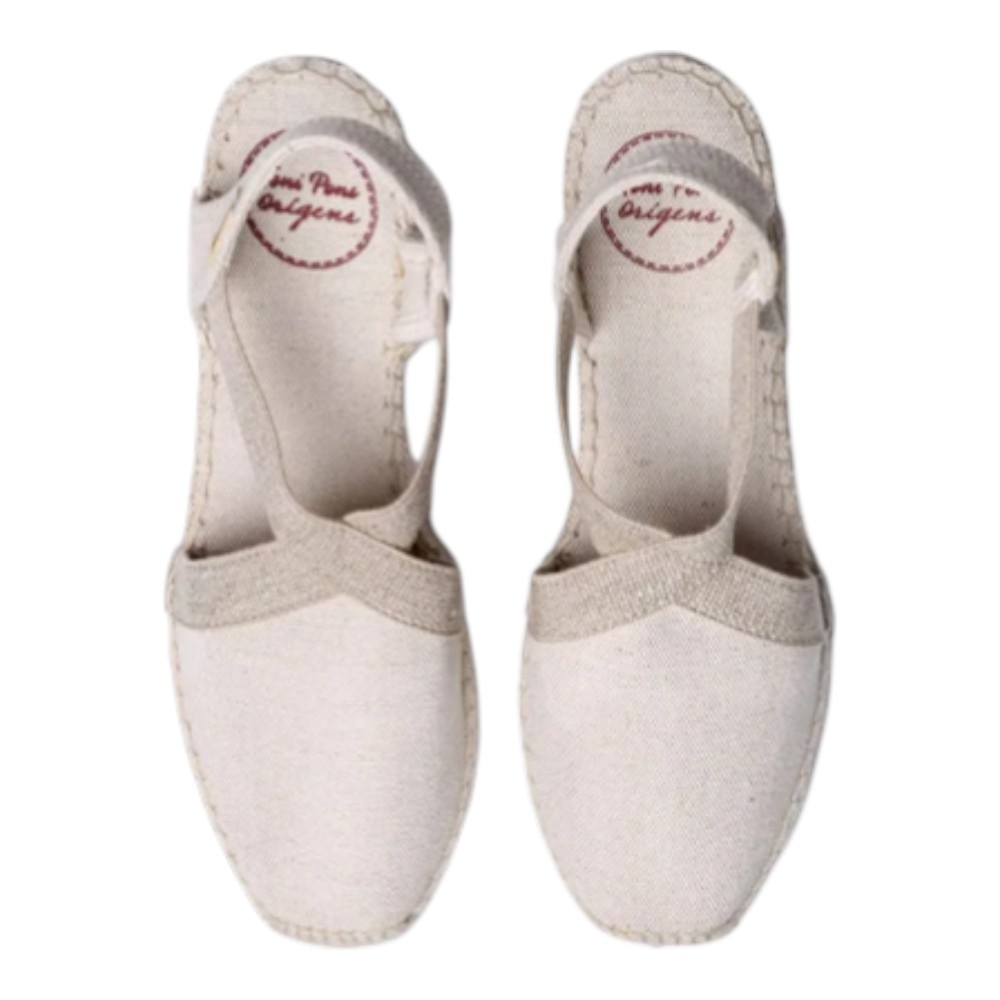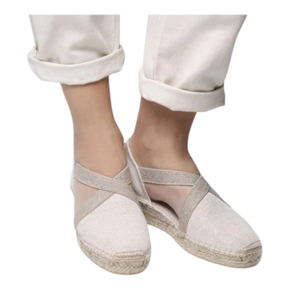El modelo VERDI-V destaca por su confección en tejido de algodón de alta calidad en un suave tono crudo, ideal para combinar con cualquier look veraniego. Su estructura cuenta con dos tiras elásticas contrastadas que se cruzan sobre el empeine, garantizando una sujeción óptima y adaptándose perfectamente al movimiento de tu pie.
