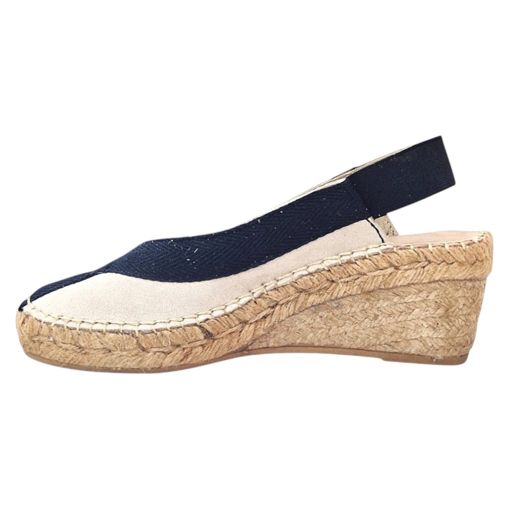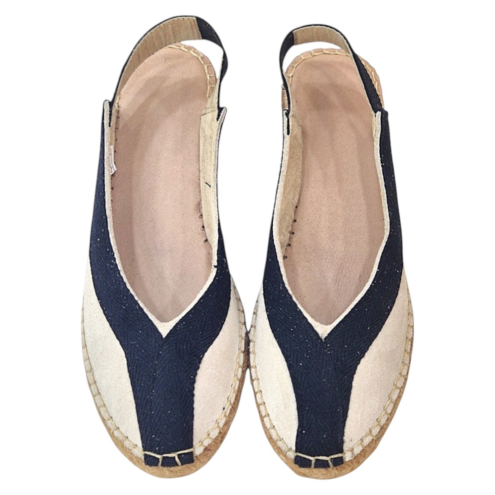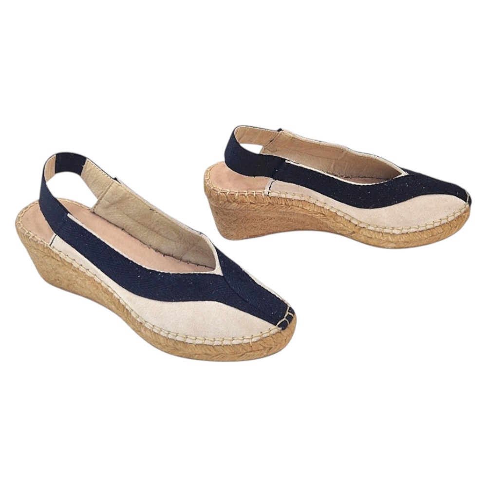 Descubre el encanto atemporal de nuestras alpargatas La Mallorquina, modelo M.259-MERCHE, en un sofisticado color crudo. Confeccionadas con una cuña de esparto tradicional y un diseño moderno que combina tiras anchas en contraste de azul marino y crudo, estas alpargatas son la elección perfecta para la mujer que busca estilo y confort. La tira elástica trasera asegura un ajuste cómodo y seguro, ideal para los días cálidos de verano. Perfectas para un look casual chic o para complementar tu atuendo de vacaciones.