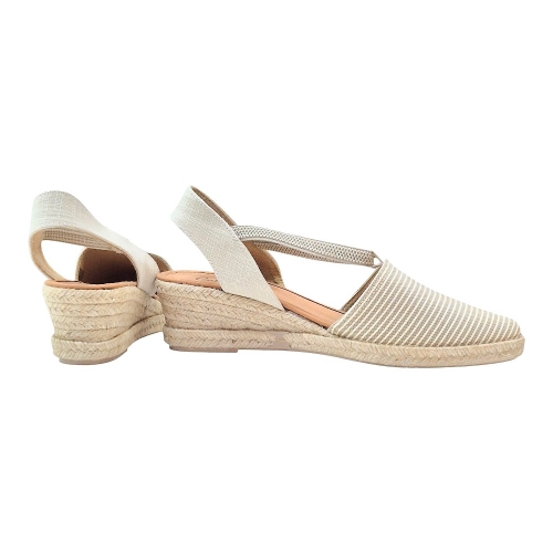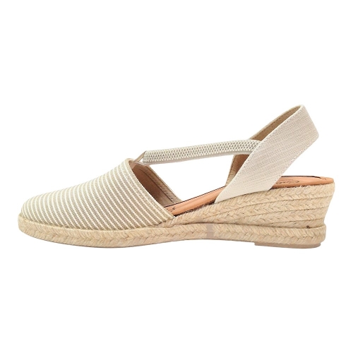 - Diseño Clásico y Versátil: Con una cuña de esparto tradicional y una pala cerrada que combina lona lisa con un elegante estampado de rayas verticales en tonos tostados y crudos, estas alpargatas ofrecen un look atemporal y fácilmente combinable.