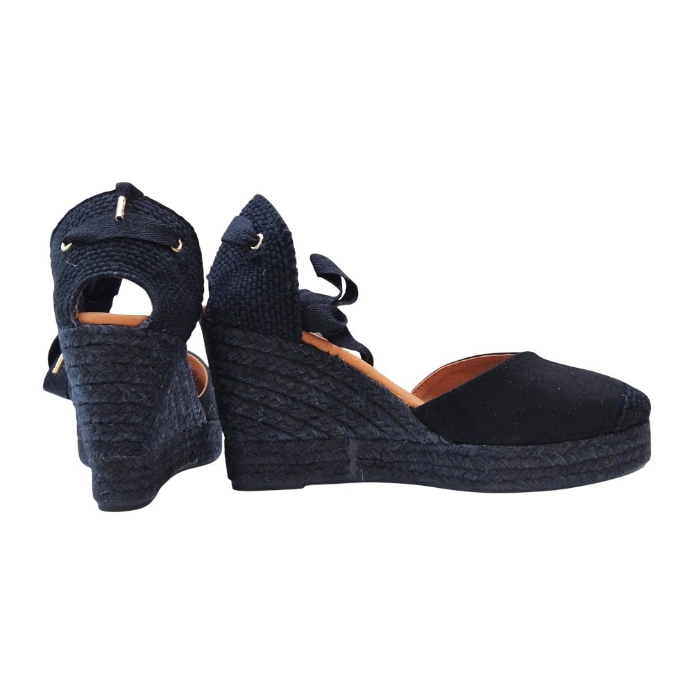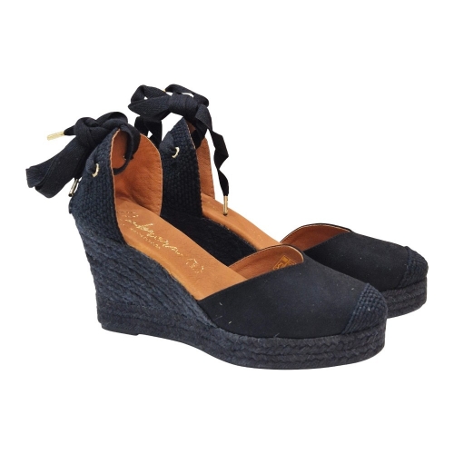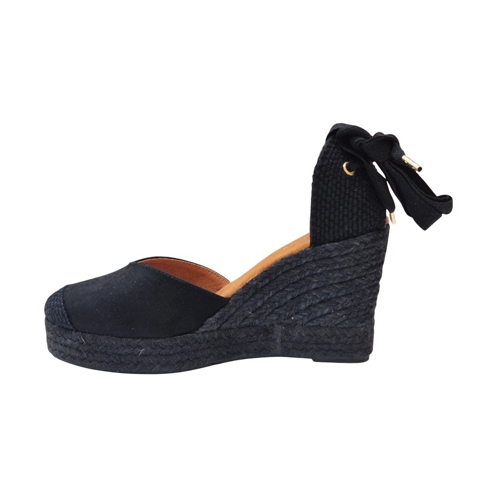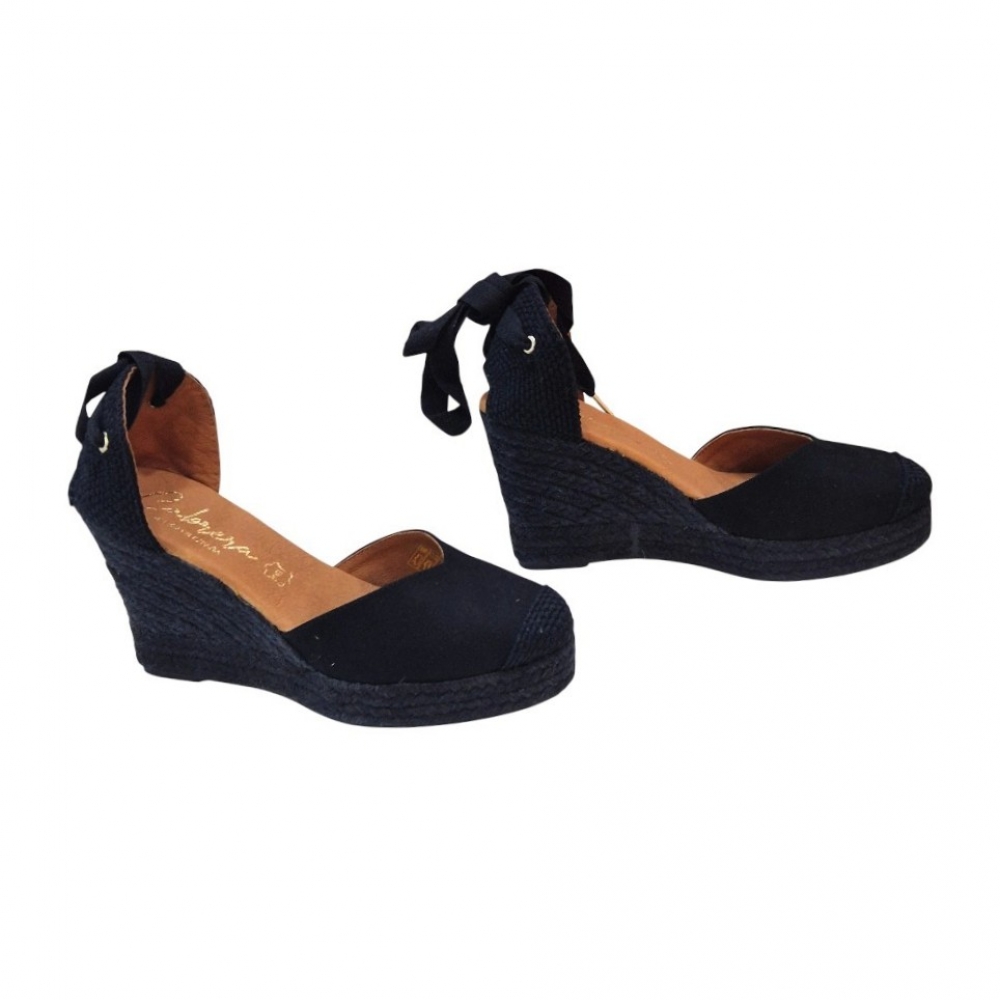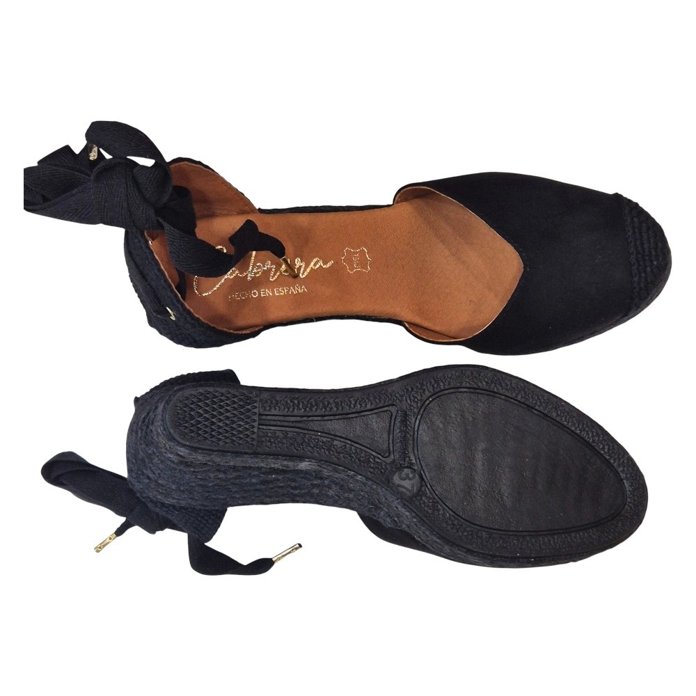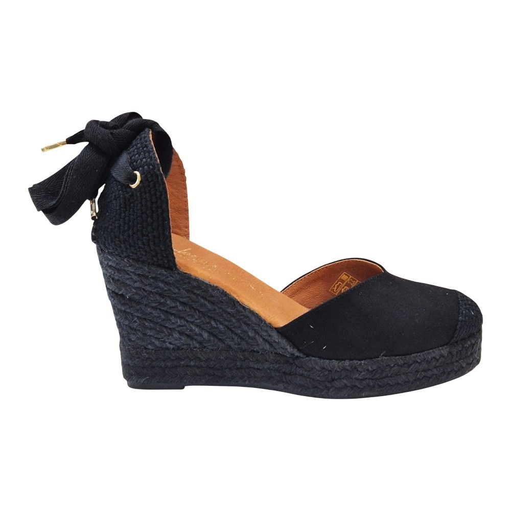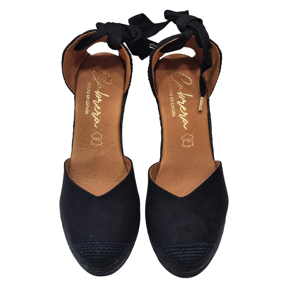 Suela de Cuña: Elaborada en cuerda trenzada de color negro a juego, manteniendo la esencia de la alpargata clásica pero con un aire más sofisticado y uniforme.