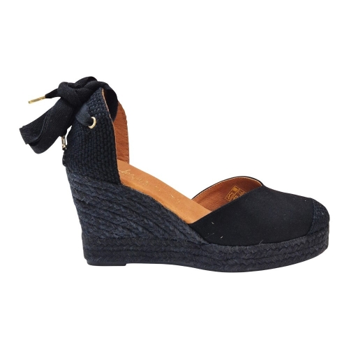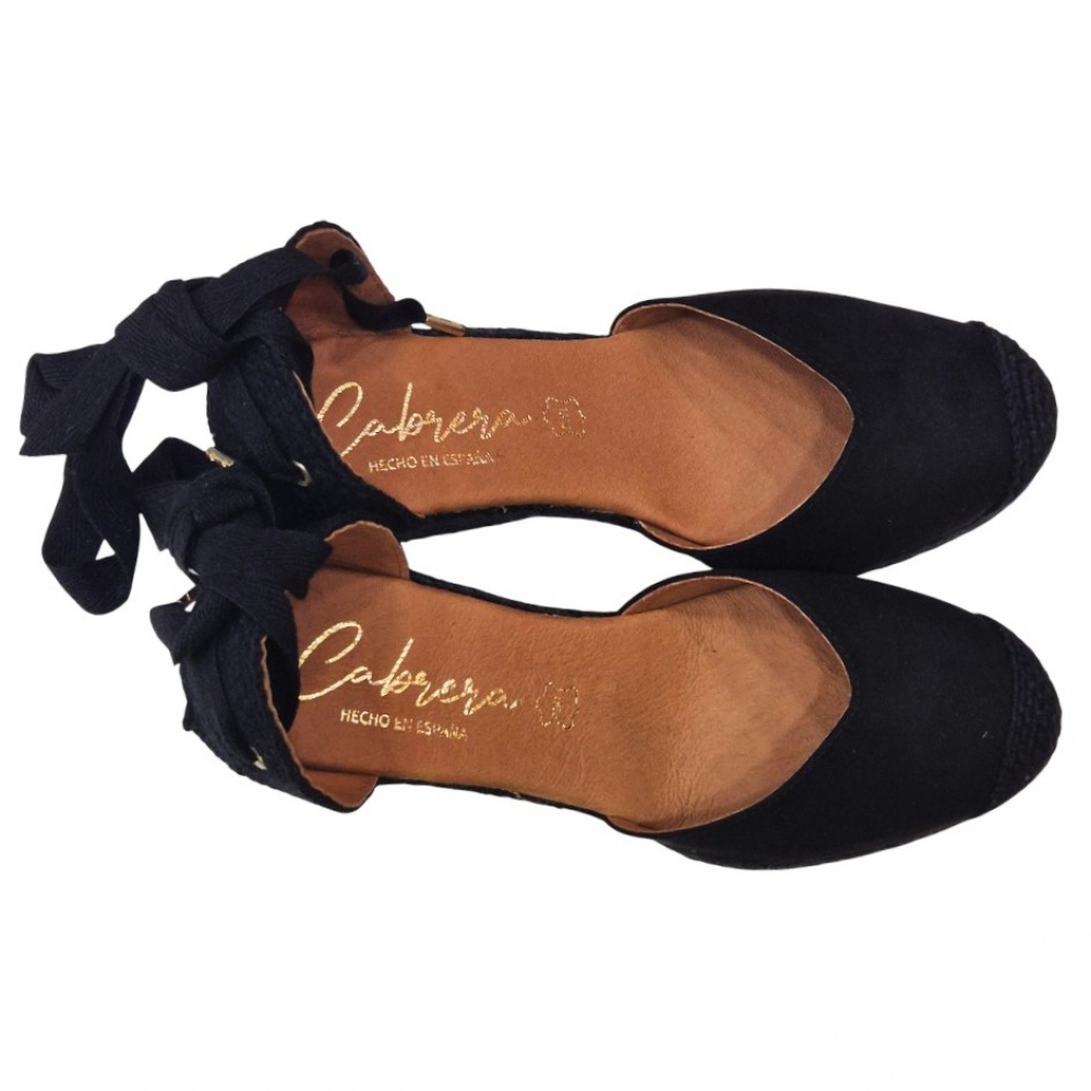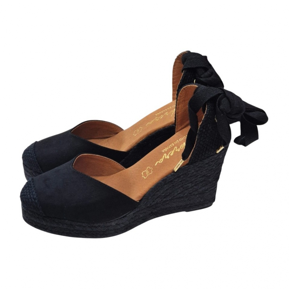 Este modelo destaca por su elegante acabado en Suede (Ante) Negro, que aporta una textura suave y lujosa. Su diseño de puntera cerrada y talón abierto con cierre de cintas permite un ajuste personalizado al tobillo, estilizando la pierna y brindando ese toque romántico y femenino tan buscado en las sandalias de cuña.