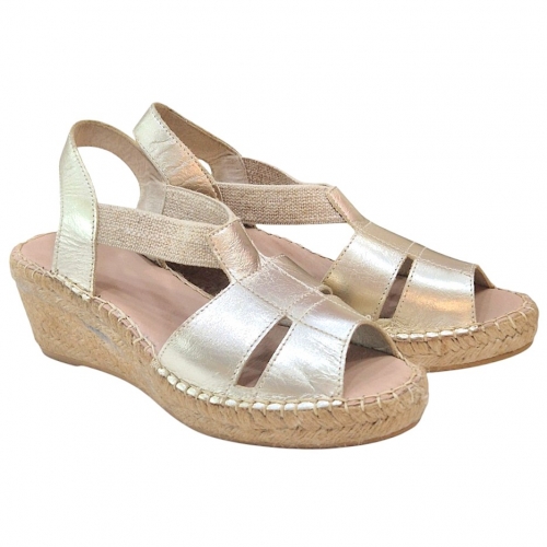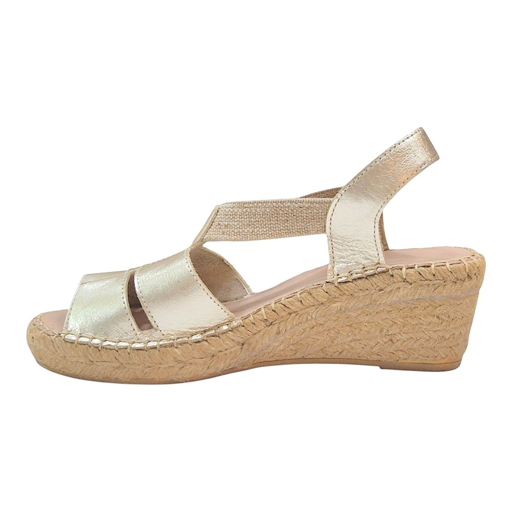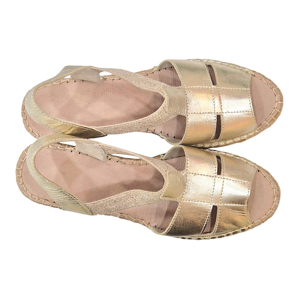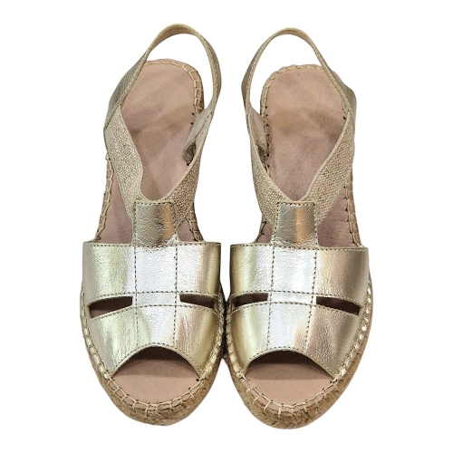 Confeccionadas en piel de alta calidad, estas alpargatas destacan por su acabado en color oro metalizado, un tono que actúa como el neutro perfecto: combina con todo y aporta un toque de gala instantáneo. Su pala presenta un diseño de tiras anchas entrelazadas con sutiles aberturas laterales que estilizan la silueta del pie y permiten una transpirabilidad ideal para los días más calurosos.