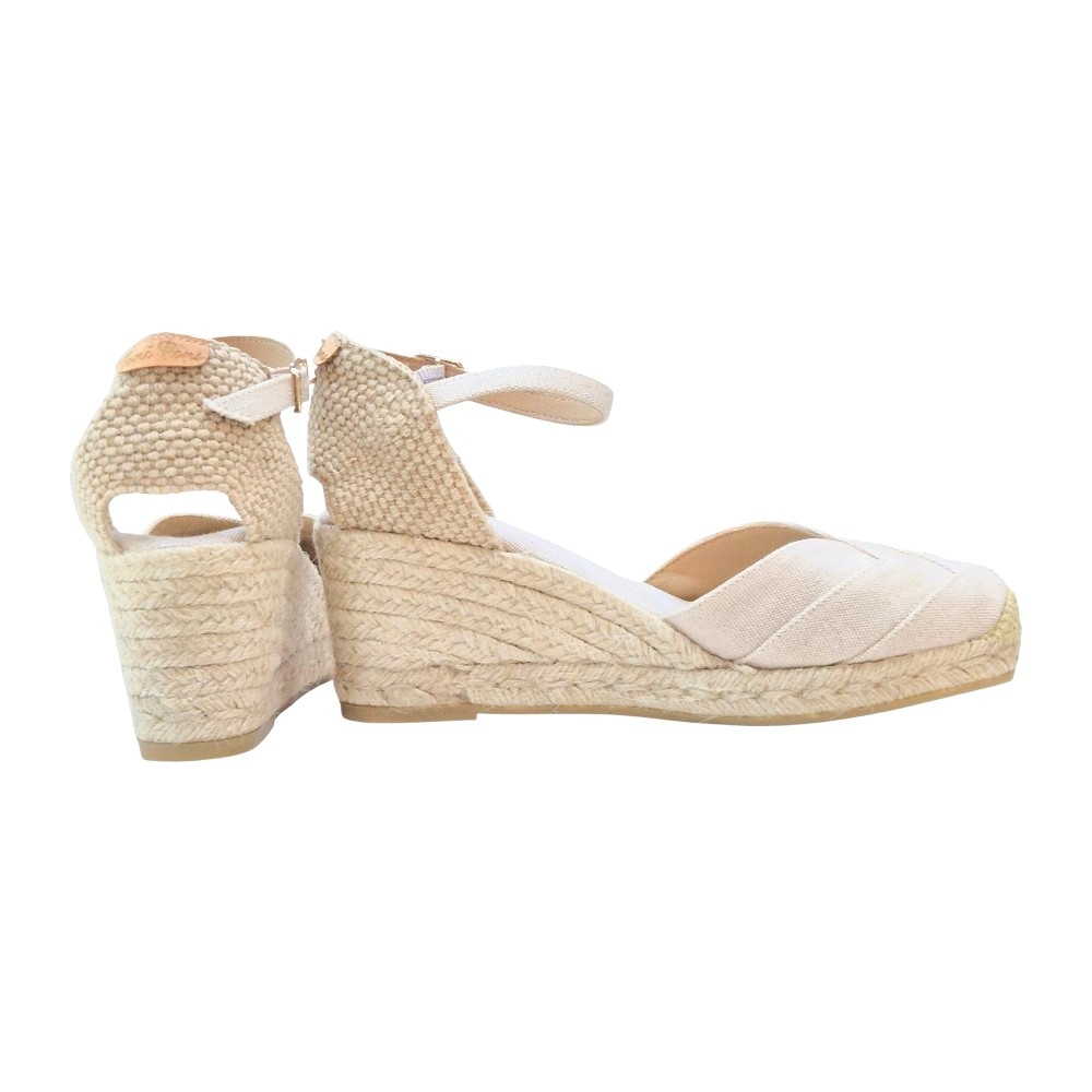 El modelo CLARA presenta una pala de lona con diseño en relieve, creando un patrón de líneas diagonales que estiliza visualmente el pie. El talón está elaborado en tejido trenzado de alta resistencia, unido a una delicada pulsera al tobillo con hebilla ajustable que asegura un calce firme y cómodo durante horas.