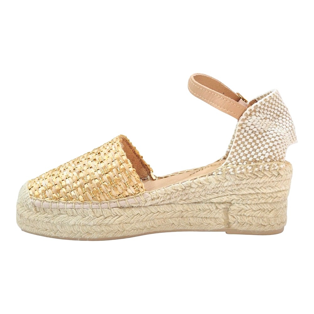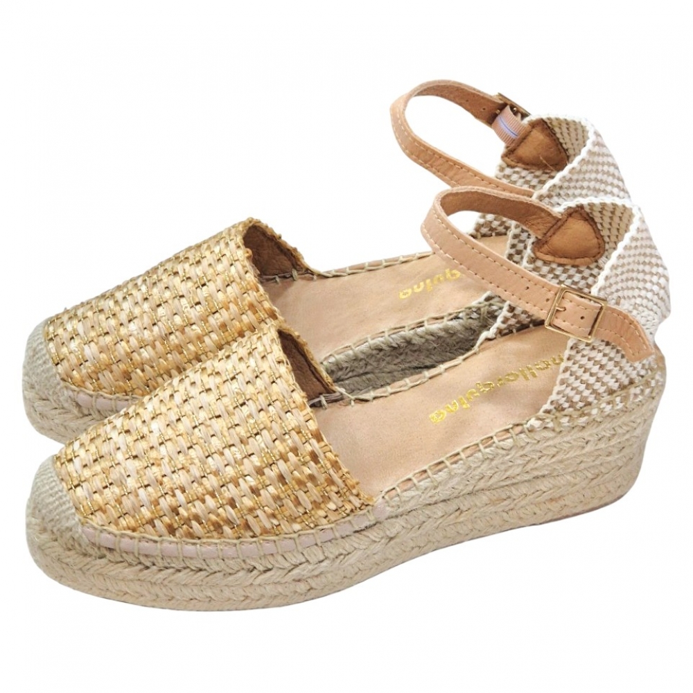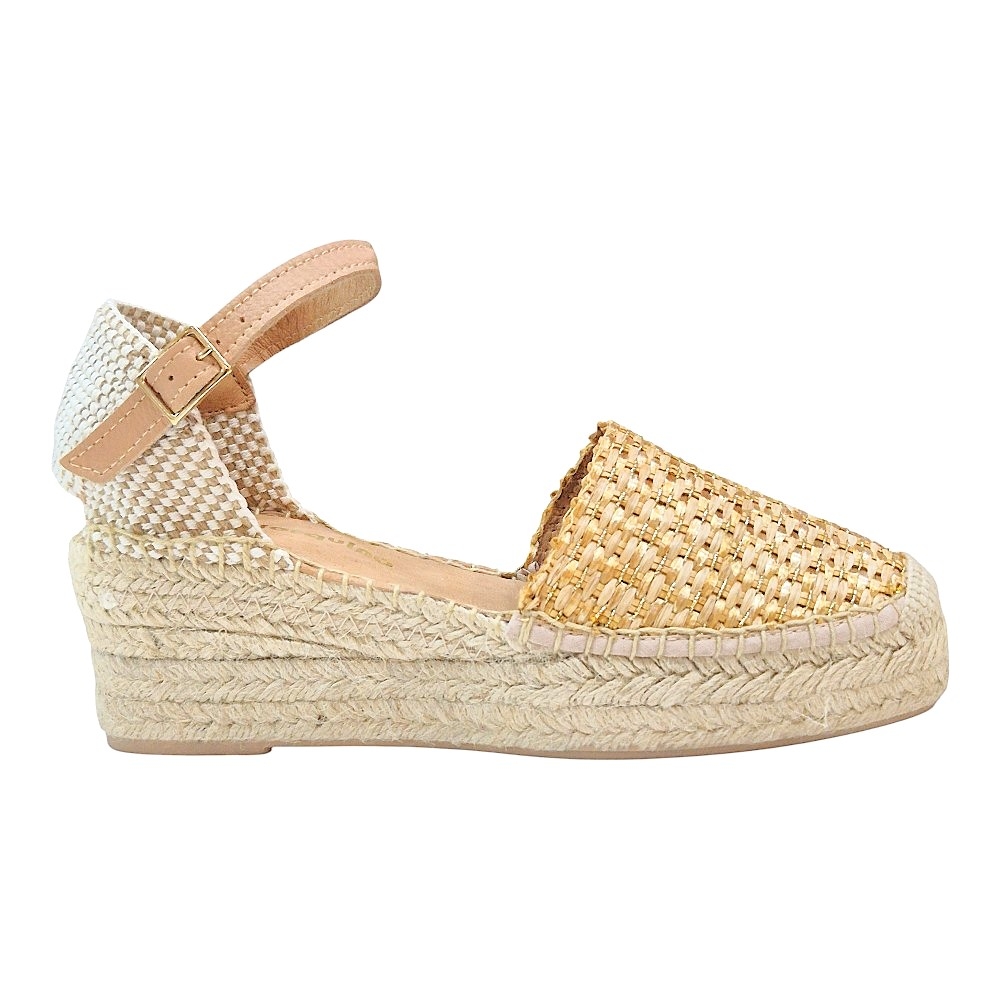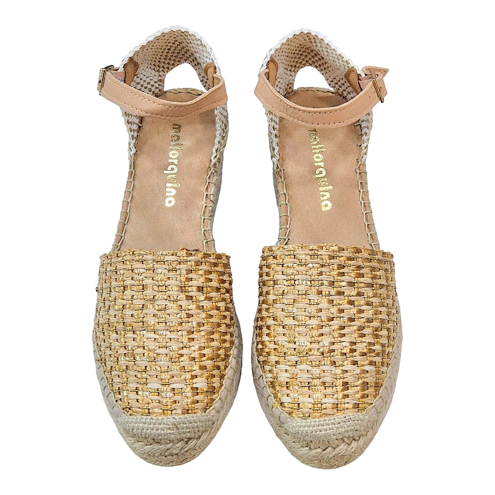 El modelo presenta una puntera cerrada confeccionada en rafia de tono arena con sutiles destellos dorados, aportando un toque de luz a cada paso. Su estructura se complementa con una talonera en tejido trenzado que garantiza una sujeción óptima y un flujo de aire constante, ideal para los días más cálidos.