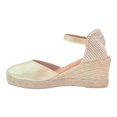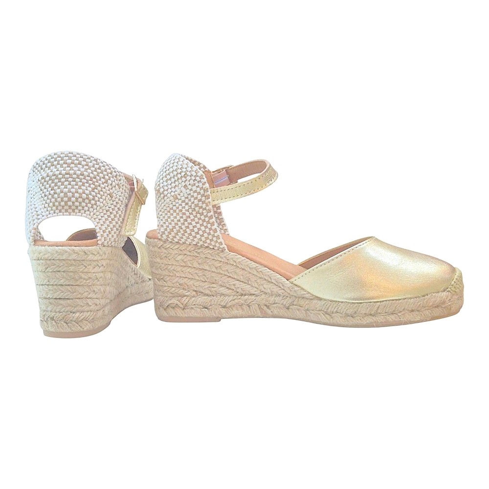 Estas alpargatas destacan por su puntera cerrada con un sutil acabado metalizado mate, que aporta un brillo discreto sin ser excesivo. El talón está elaborado en un tejido trenzado bicolor (natural y blanco) que garantiza transpirabilidad y una sujeción perfecta, rematado con una delicada pulsera al tobillo con hebilla ajustable para caminar con total seguridad.