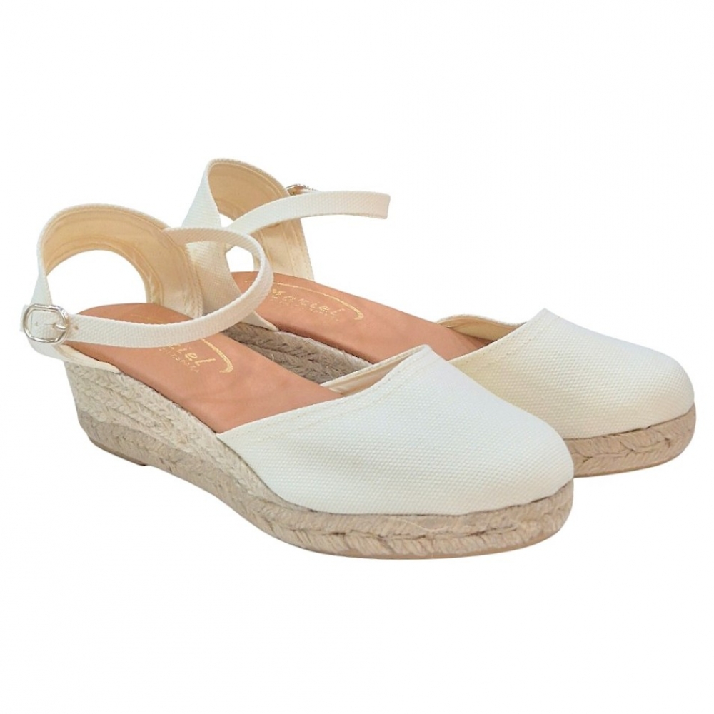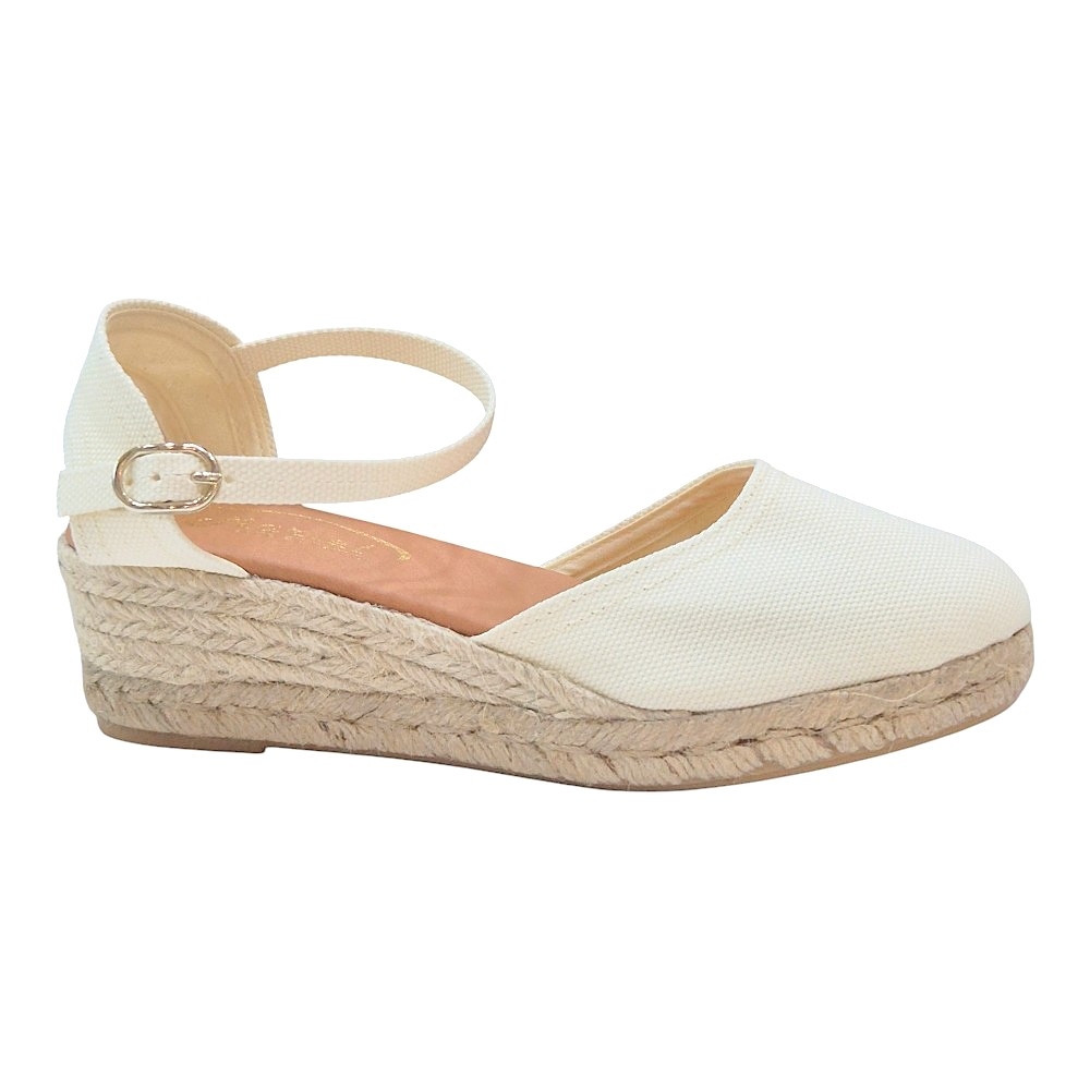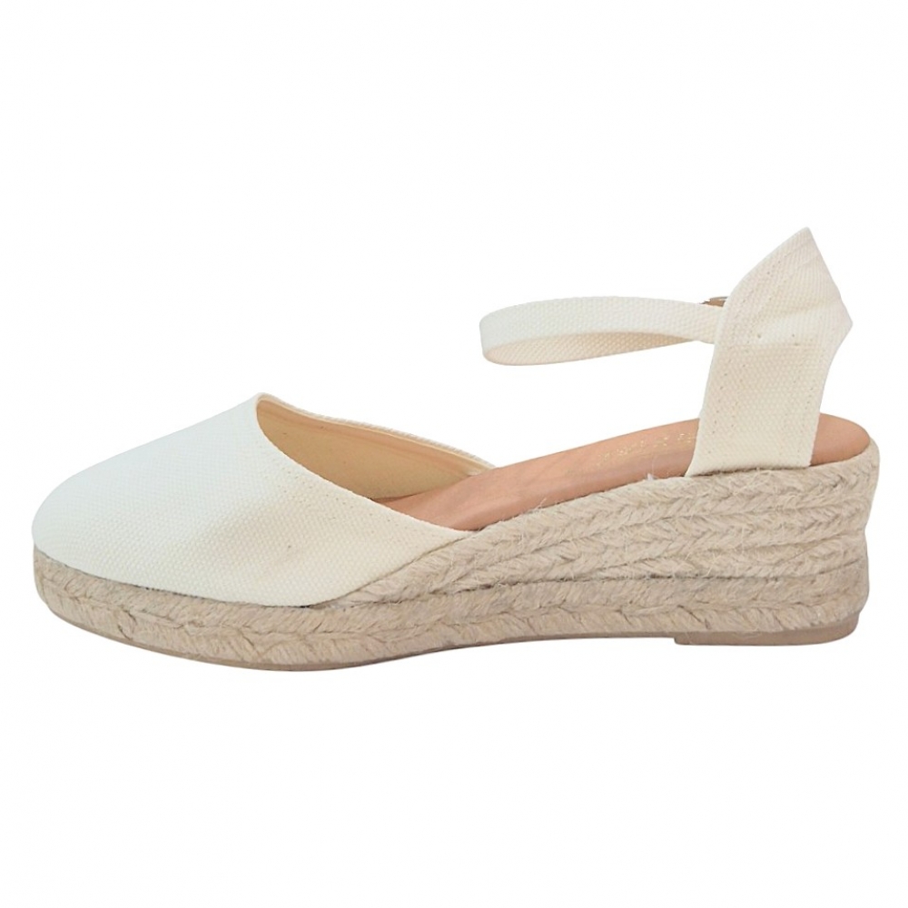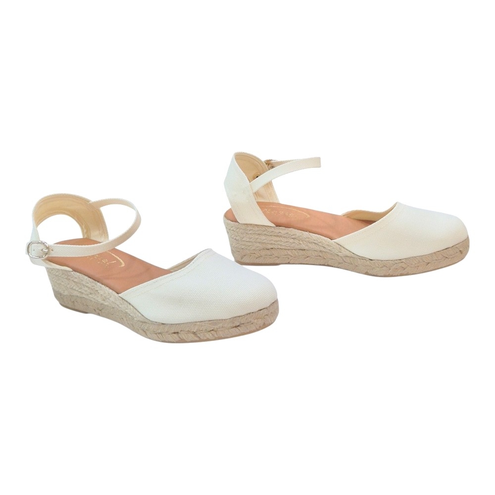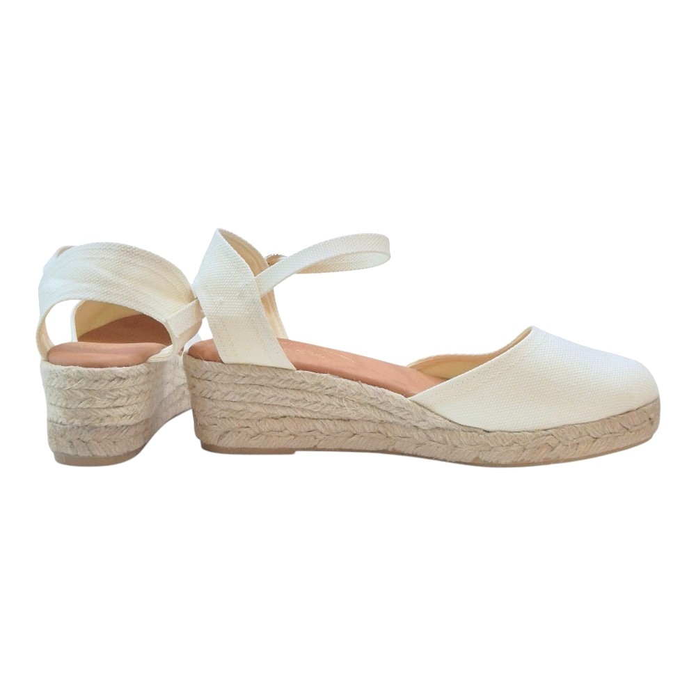 Cuña de Esparto Natural: Suela de yute trenzado de altura media, ideal para estilizar la figura sin renunciar a la comodidad durante todo el día.