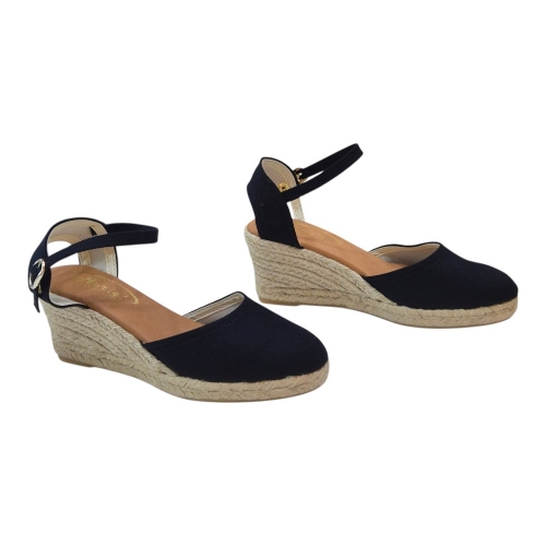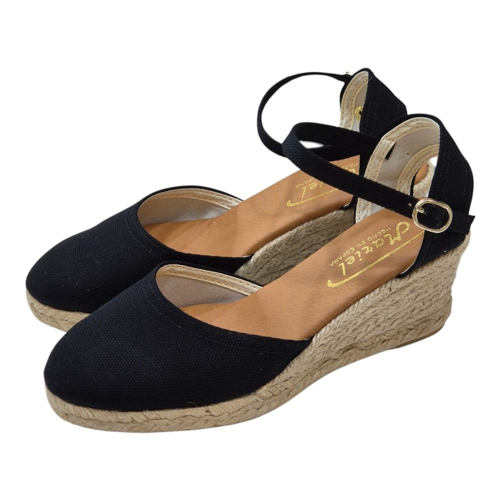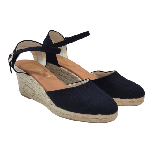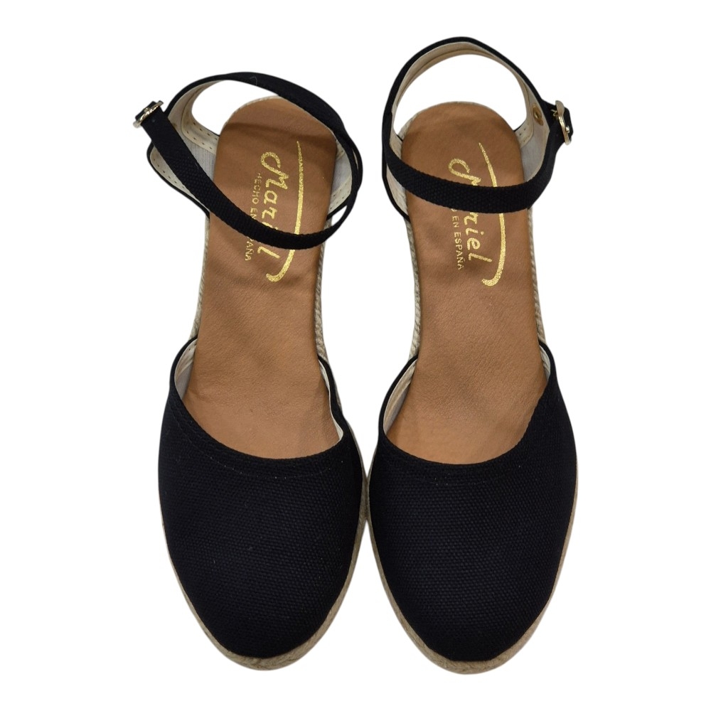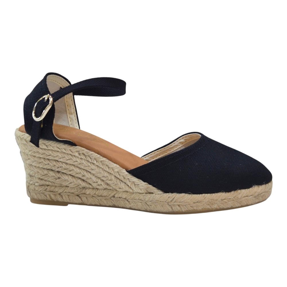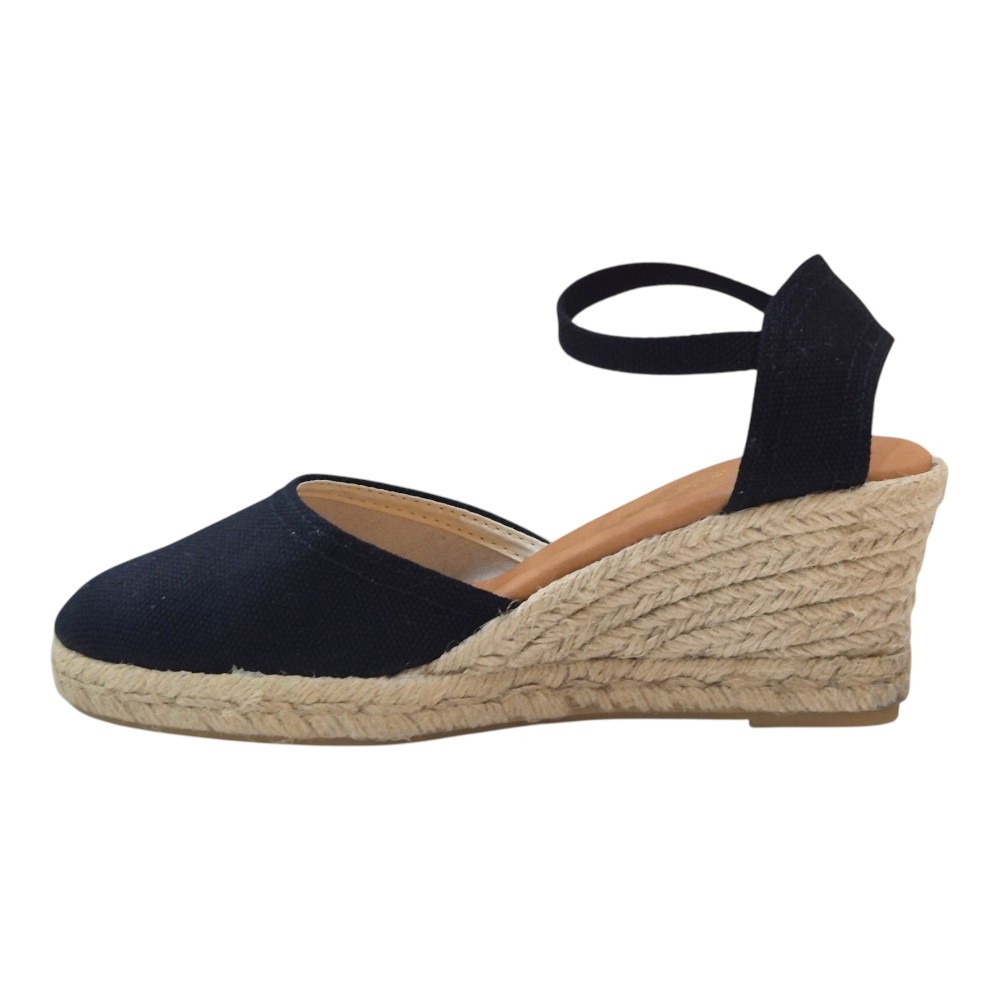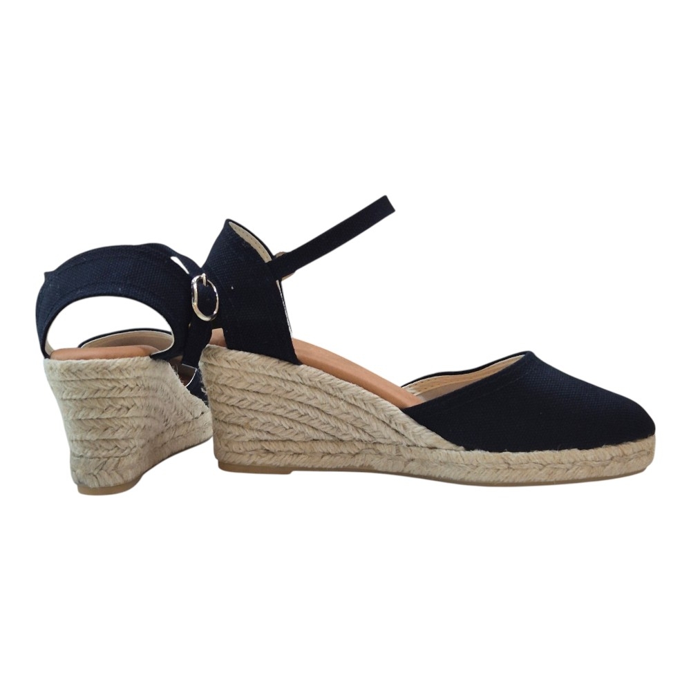 Este modelo destaca por su puntera cerrada y redondeada, que ofrece un look más formal que la sandalia clásica pero con toda la frescura del esparto. Es el básico imprescindible que une la sobriedad del negro con la calidez de los materiales naturales.