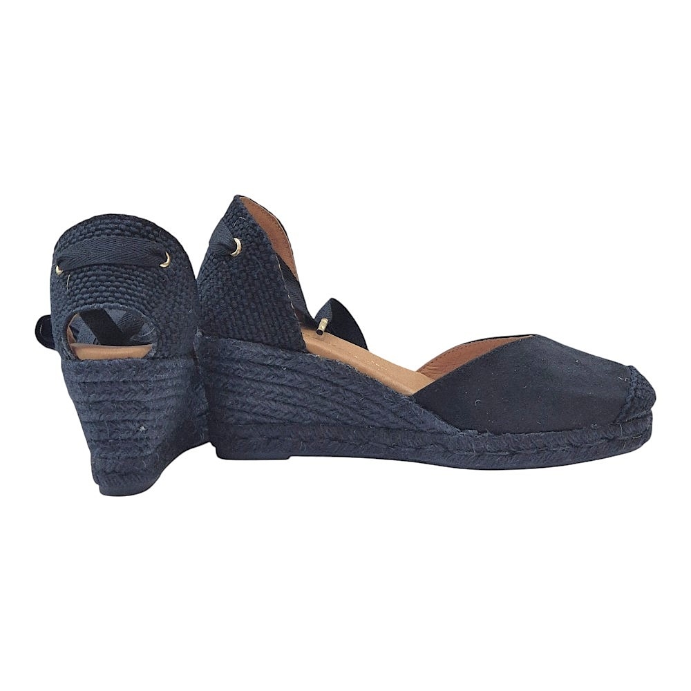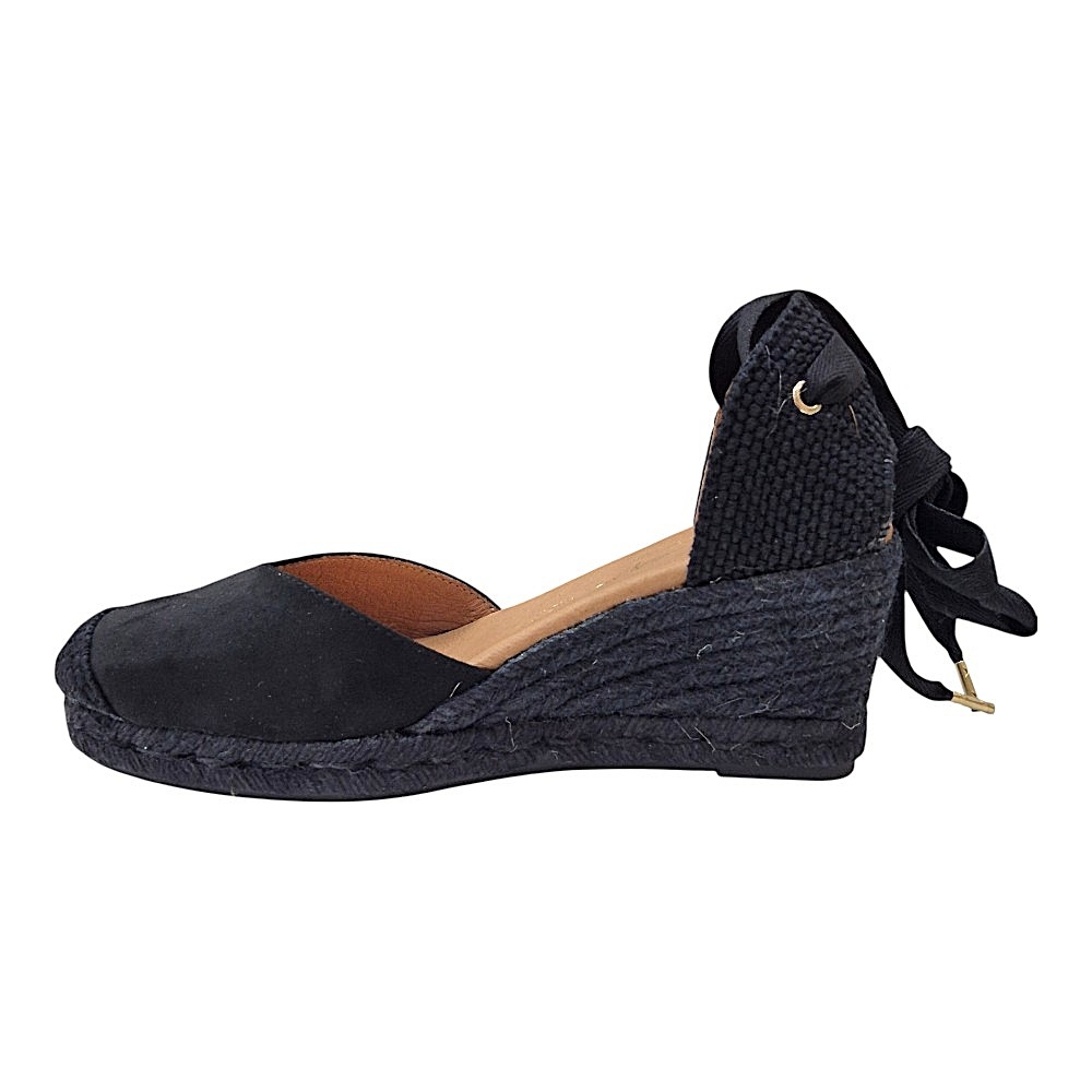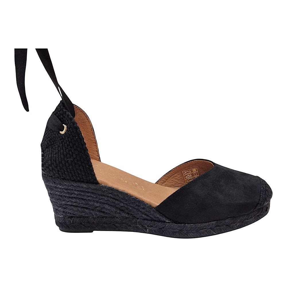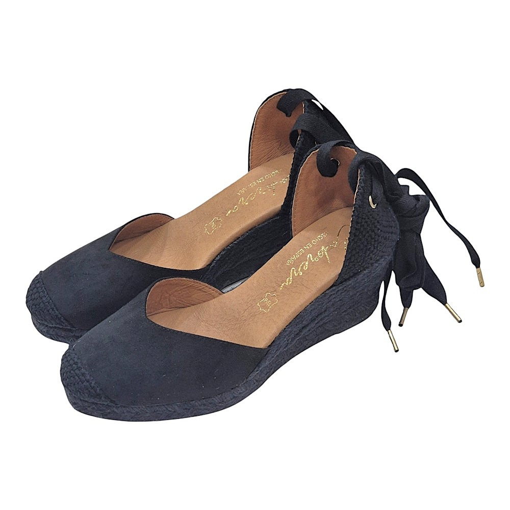 - Diseño Exclusivo: Estas alpargatas presentan un elegante corte en suave suede de color negro, aportando un toque de distinción y versatilidad a tu vestuario. Su diseño de pala cerrada y talón cubierto con cierre de cintas largas para atar al tobillo no solo asegura una sujeción perfecta, sino que también añade un detalle de estilo único y femenino.