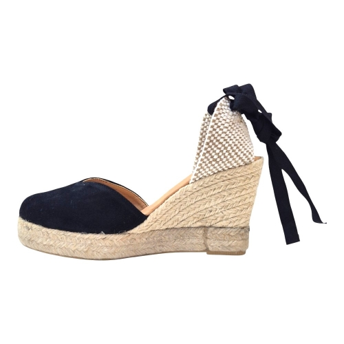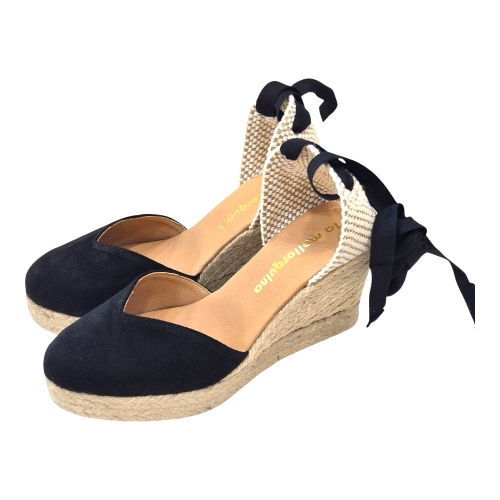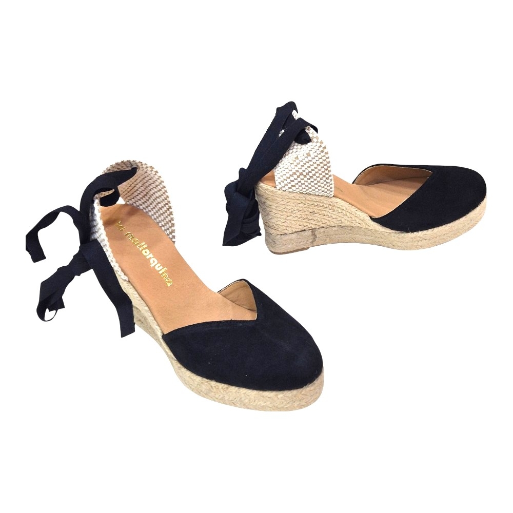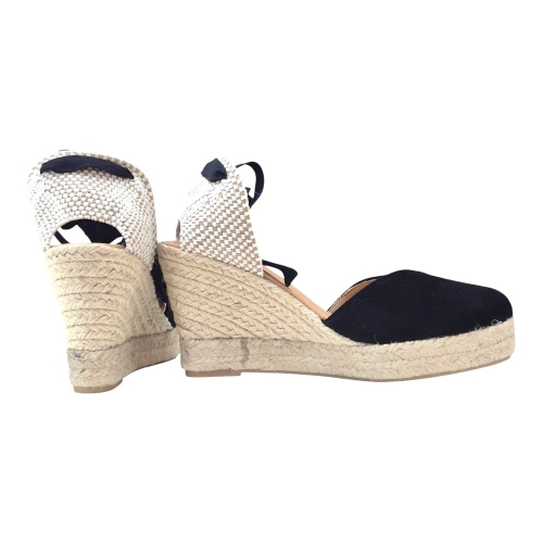 Confeccionadas con una base de doble cuerda natural, que aporta un toque rústico y auténtico, estas alpargatas se realzan con un suave y sofisticado empeine de ante en color negro. La cuña, elaborada con el clásico trenzado de yute, no solo estiliza la figura sino que también ofrece una pisada estable y confortable. El diseño se completa con unas elegantes cintas negras que se atan al tobillo, permitiendo un ajuste personalizado y añadiendo un toque femenino y versátil.