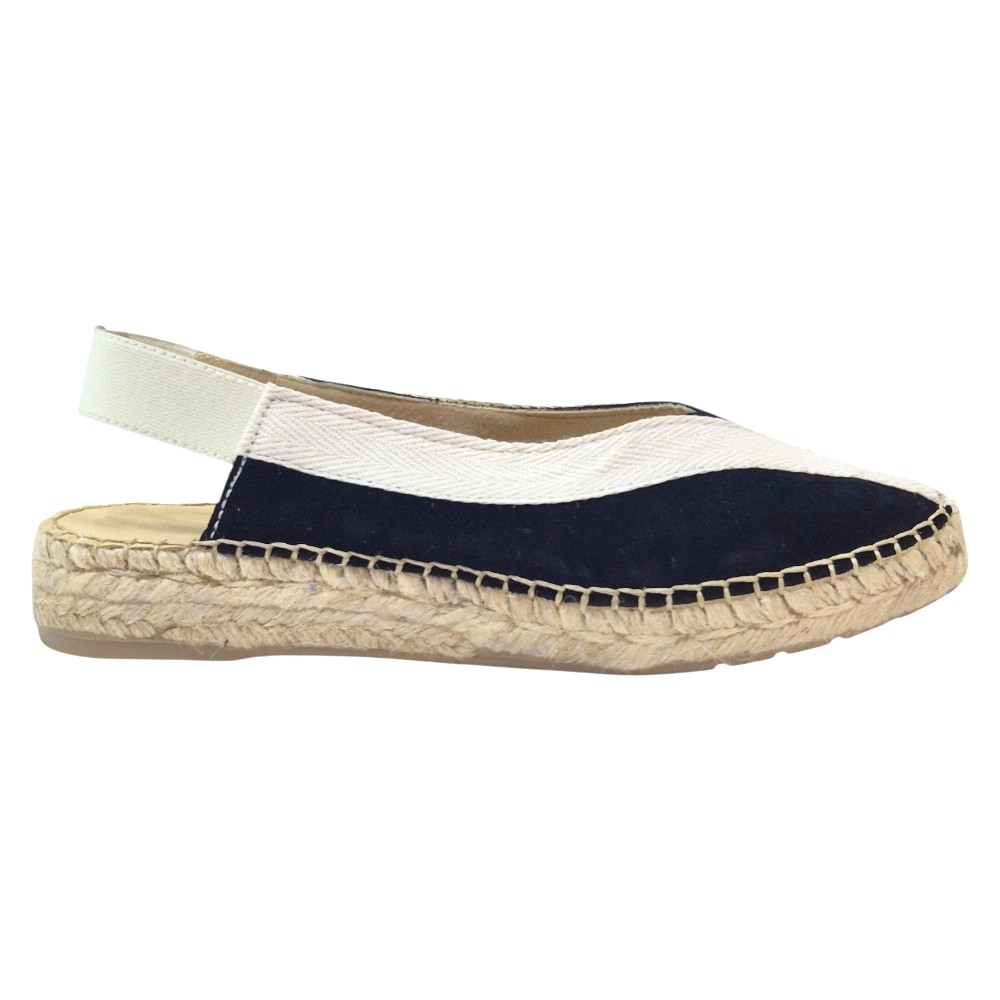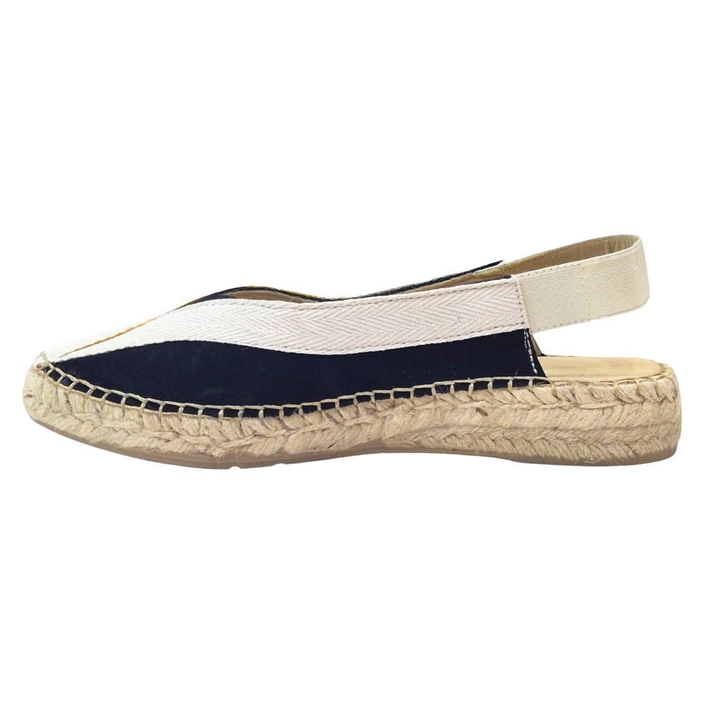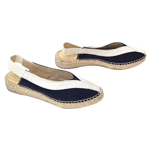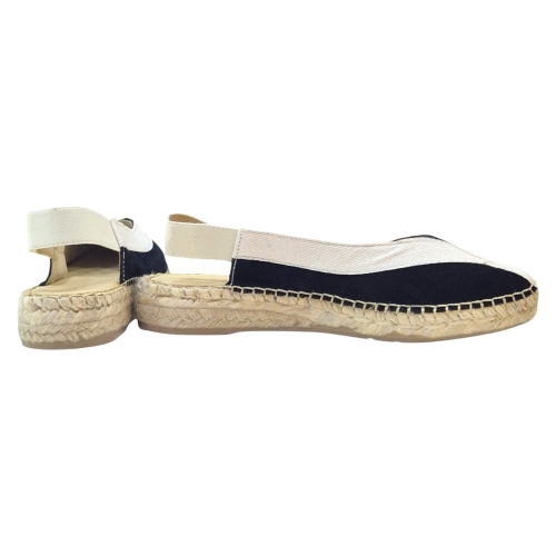 Confeccionadas con materiales de primera calidad, el cuerpo de la alpargata en un sofisticado color negro se realza con unas distintivas cintas en tono beige, creando un contraste visual que aporta un toque chic y atemporal. El diseño de punta cerrada y talón descubierto con tira elástica asegura un ajuste cómodo y seguro, adaptándose a la forma de tu pie para un confort duradero.