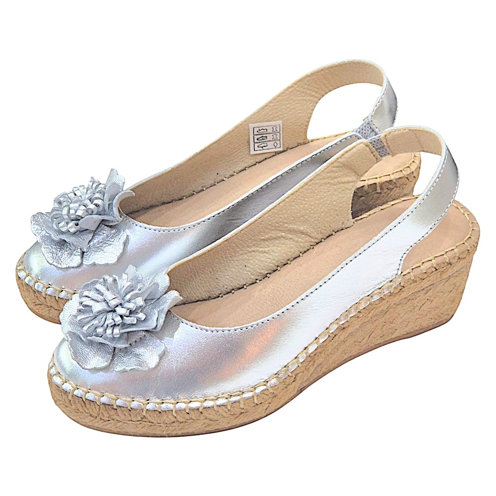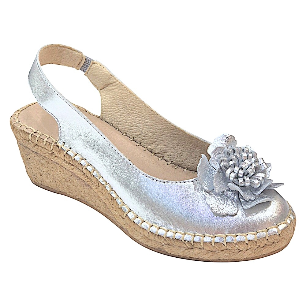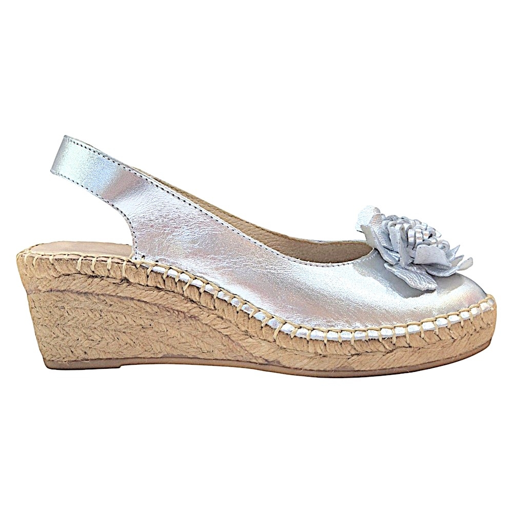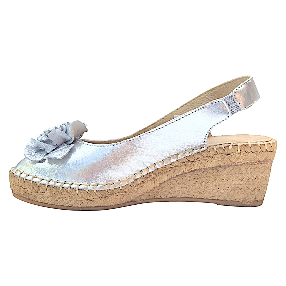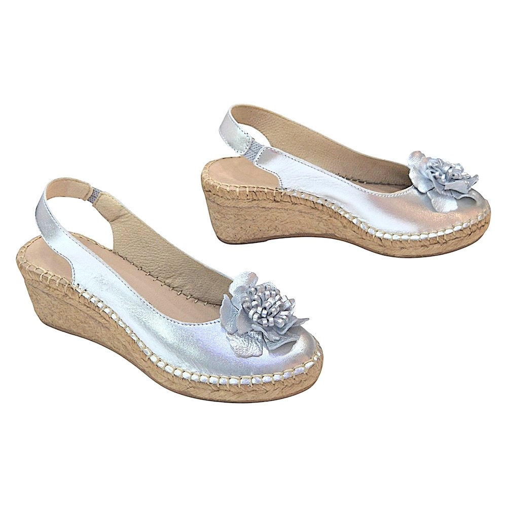 Marca: La Mallorquina Modelo: 401FLOR Color: Plata Tipo de cierre: Tira elástica en el talón para mayor sujeción y facilidad al calzar. Material exterior: Piel sintética efecto metalizado de alta calidad. Material interior: Piel transpirable para un confort óptimo. Suela: Yute natural y base de goma antideslizante para mayor seguridad. Altura de la cuña: 6 cm
