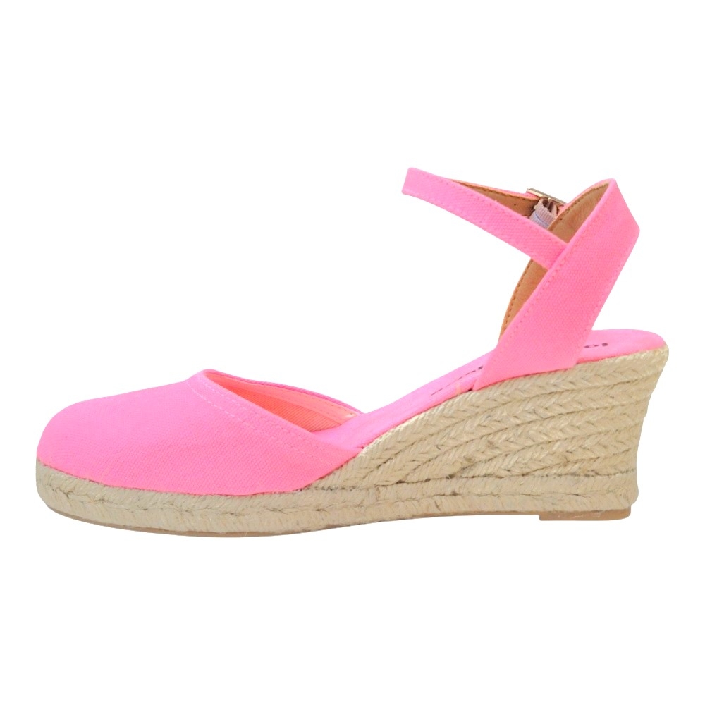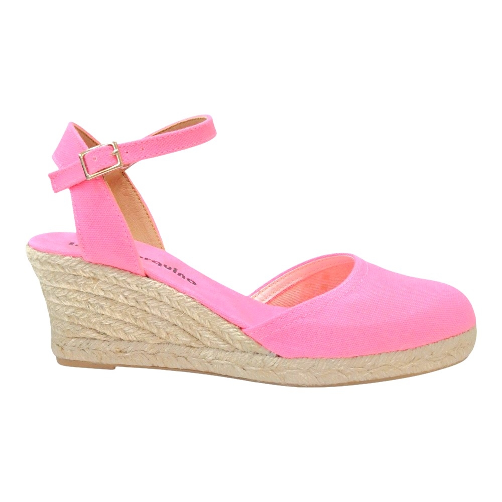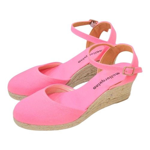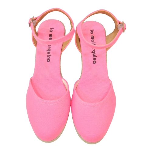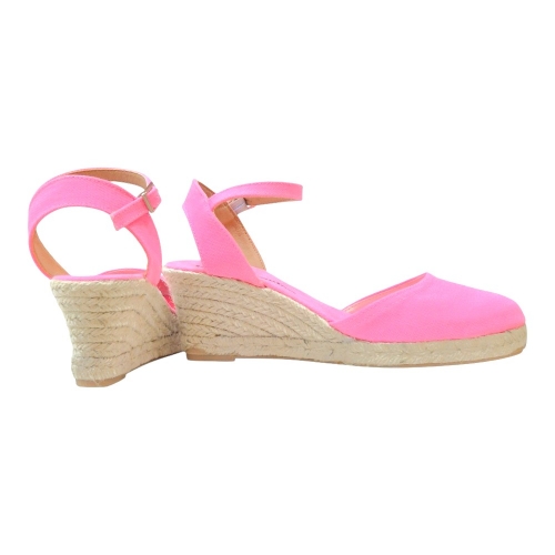 Confeccionadas con materiales de alta calidad, la parte superior de estas alpargatas presenta un suave tejido en un llamativo tono rosa fucsia, que aporta un toque de color y vitalidad a cada paso. La cuña, elaborada con esparto natural trenzado, no solo ofrece una altura cómoda y estable, sino que también evoca la artesanía tradicional mediterránea, añadiendo un encanto rústico y auténtico.