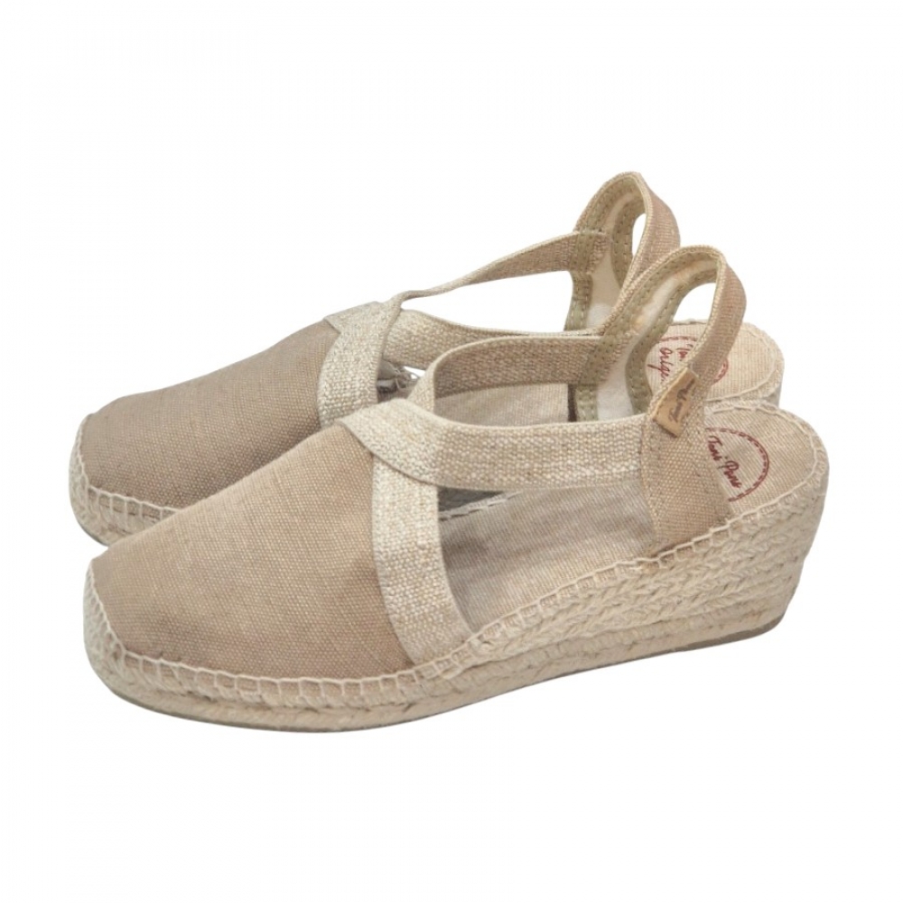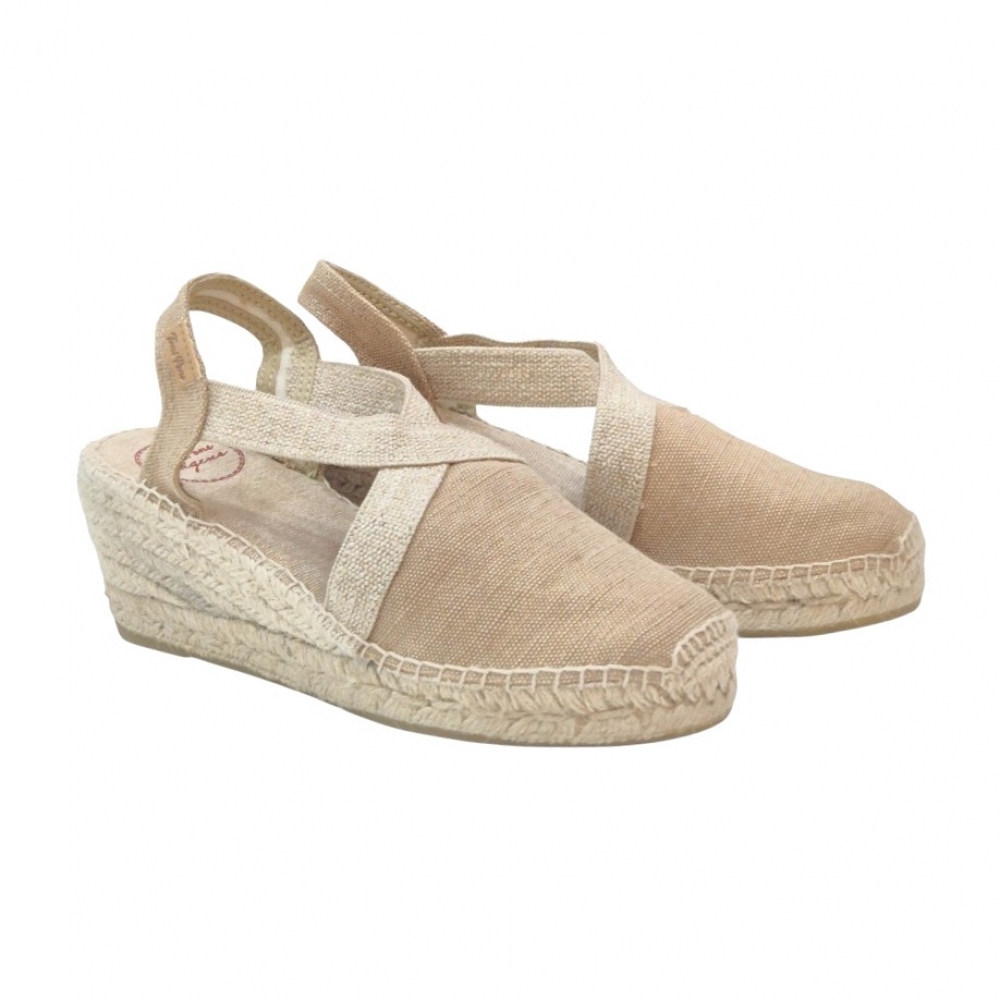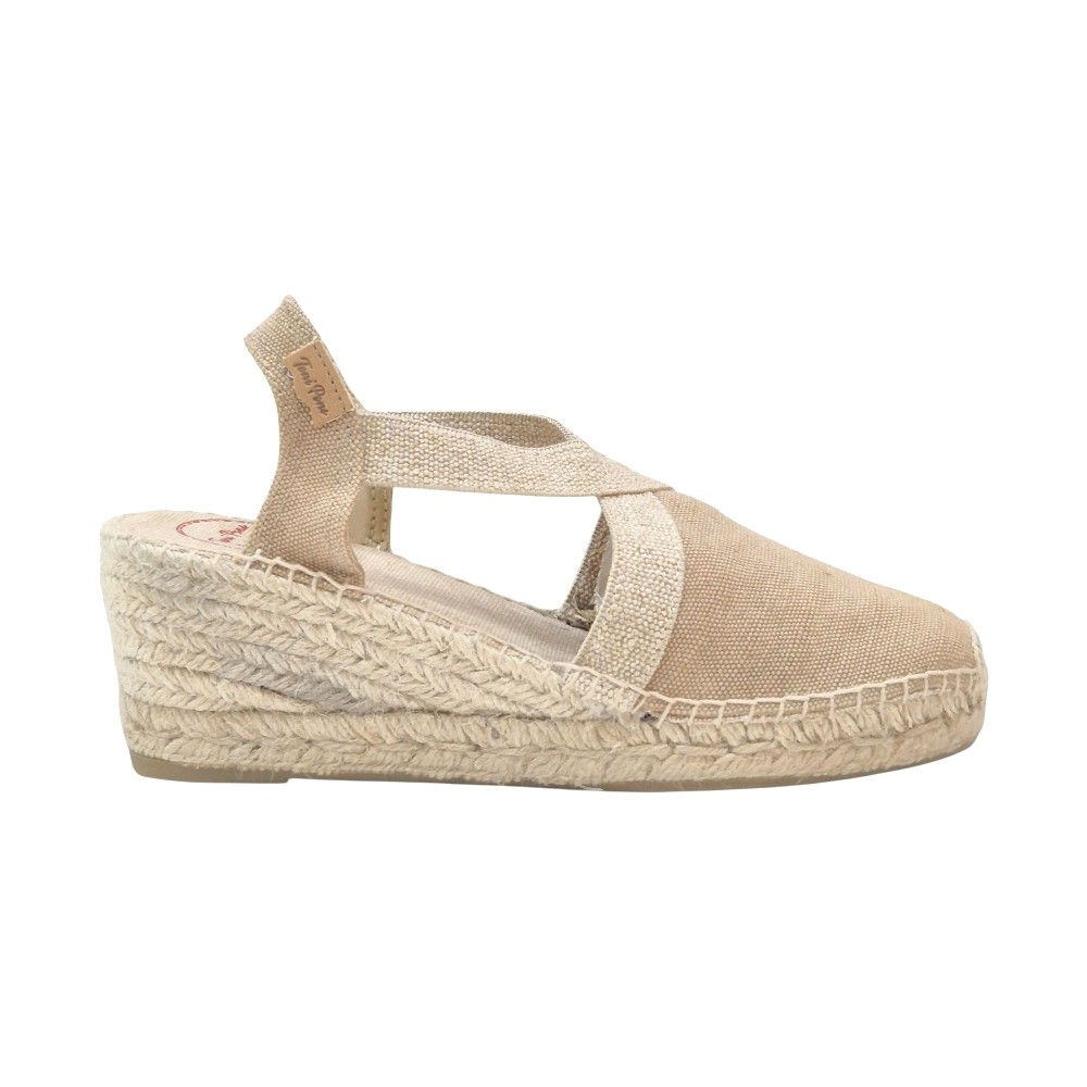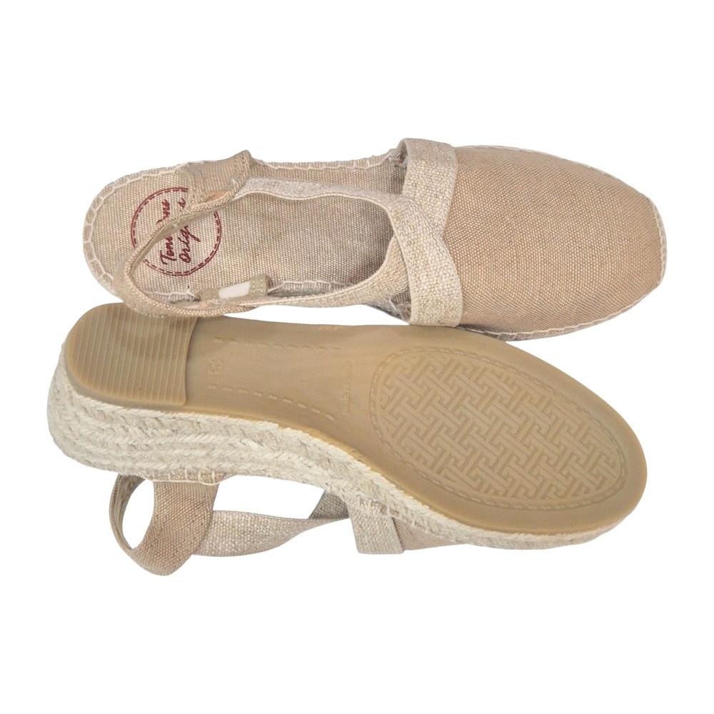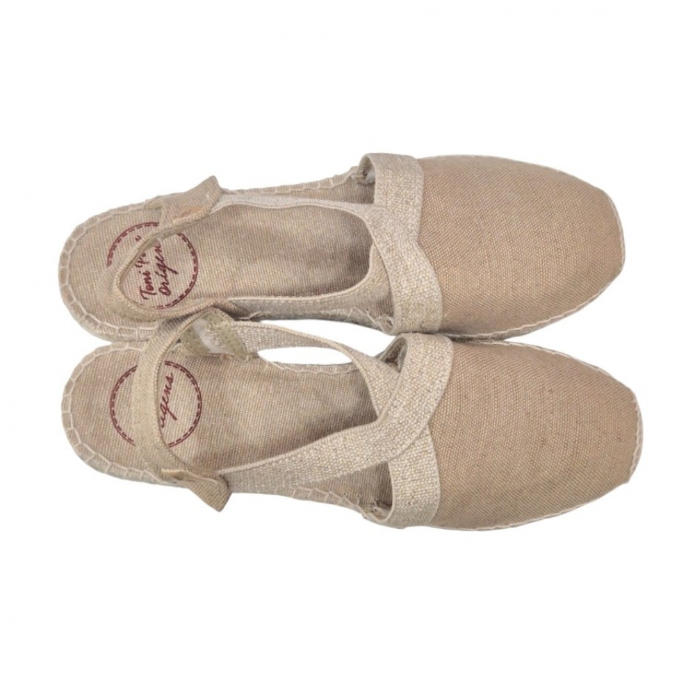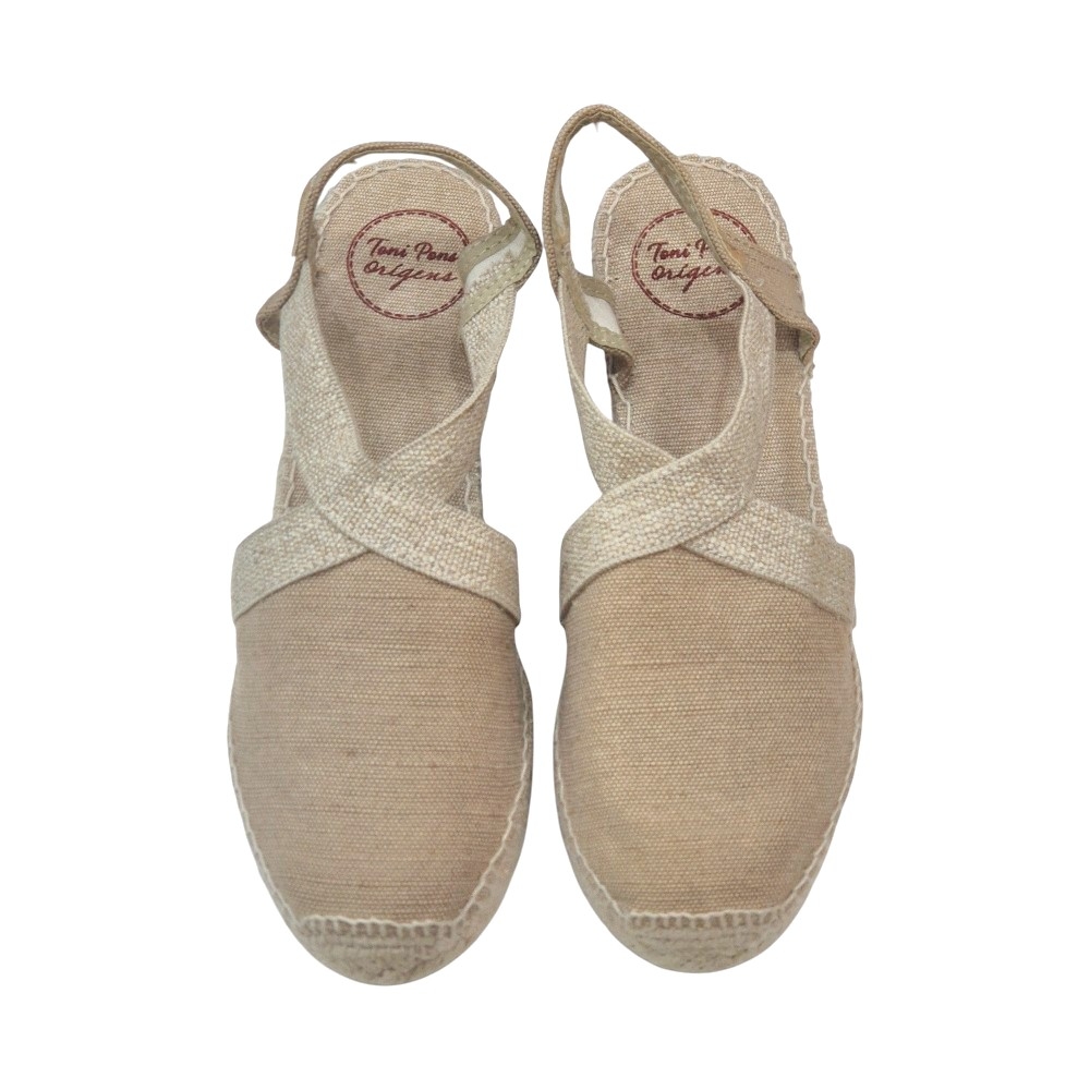 Fiel a la tradición de Toni Pons, la unión entre la tela y la suela está cosida a mano con hilo de algodón de alta resistencia. La cuña está elaborada íntegramente en trenza de yute natural y cuenta con una altura total de 5 cm, proporcionando esa elevación sutil que estiliza la figura sin sacrificar la estabilidad.