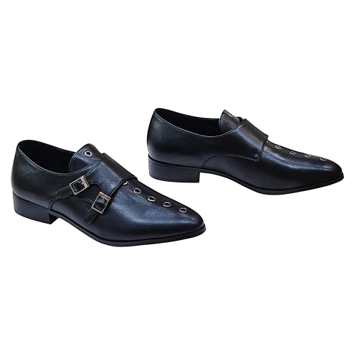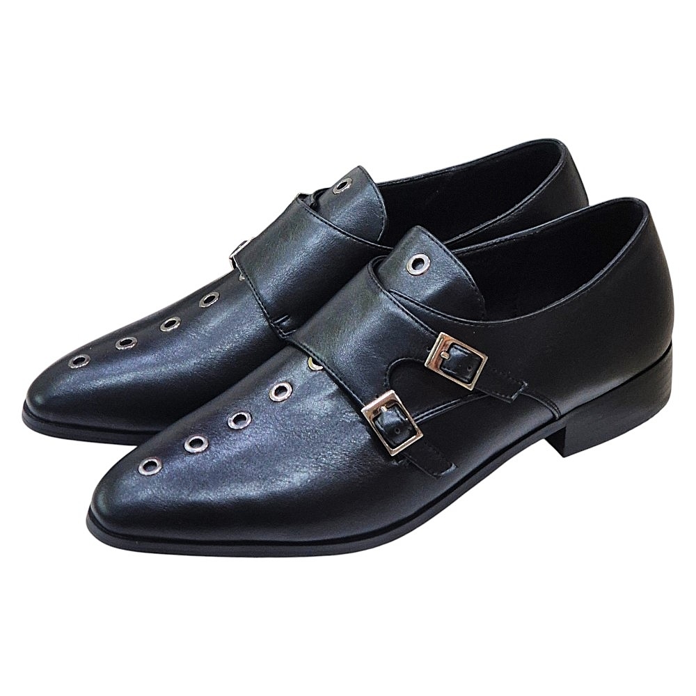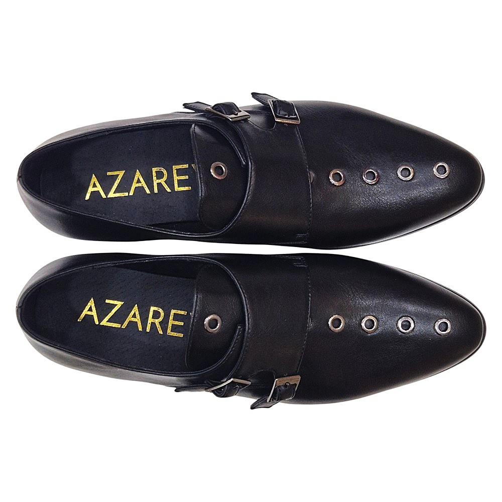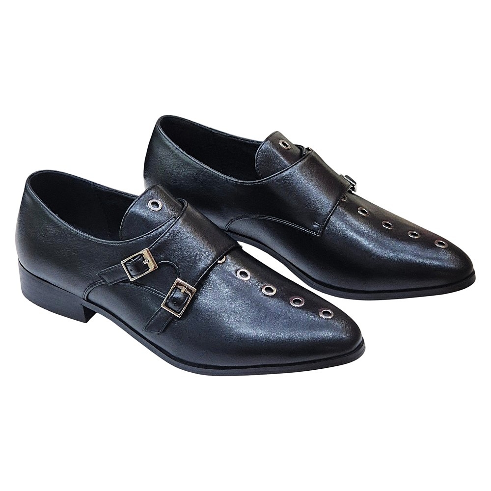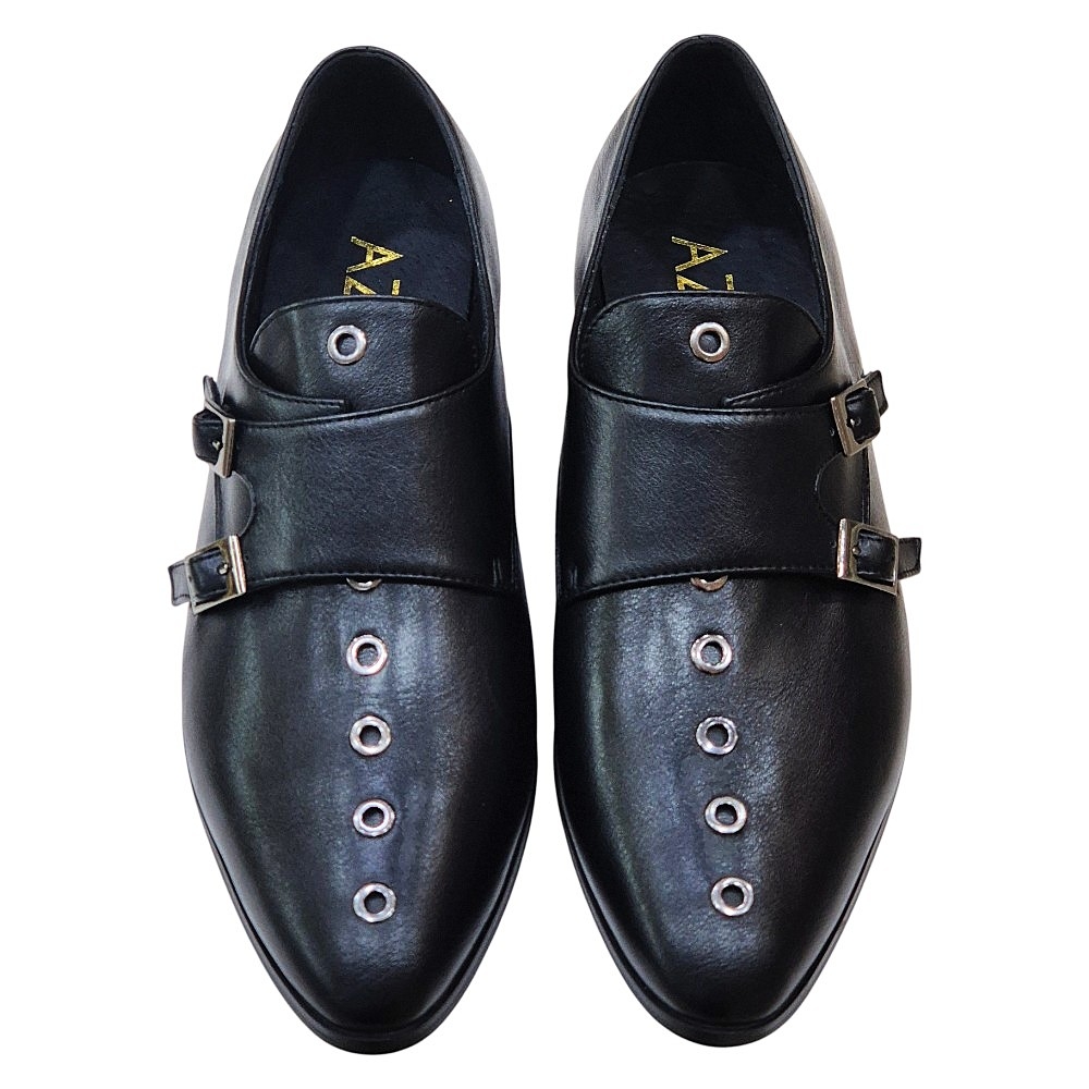Confeccionados en piel de alta calidad, estos zapatos ofrecen una durabilidad excepcional y un acabado impecable. Su diseño presenta un estilo monk strap doble con dos hebillas metálicas que aportan un toque de carácter y permiten un ajuste personalizado y seguro. Los detalles de ojales metálicos a lo largo del empeine añaden un toque contemporáneo y audaz, diferenciándolos de los diseños clásicos.