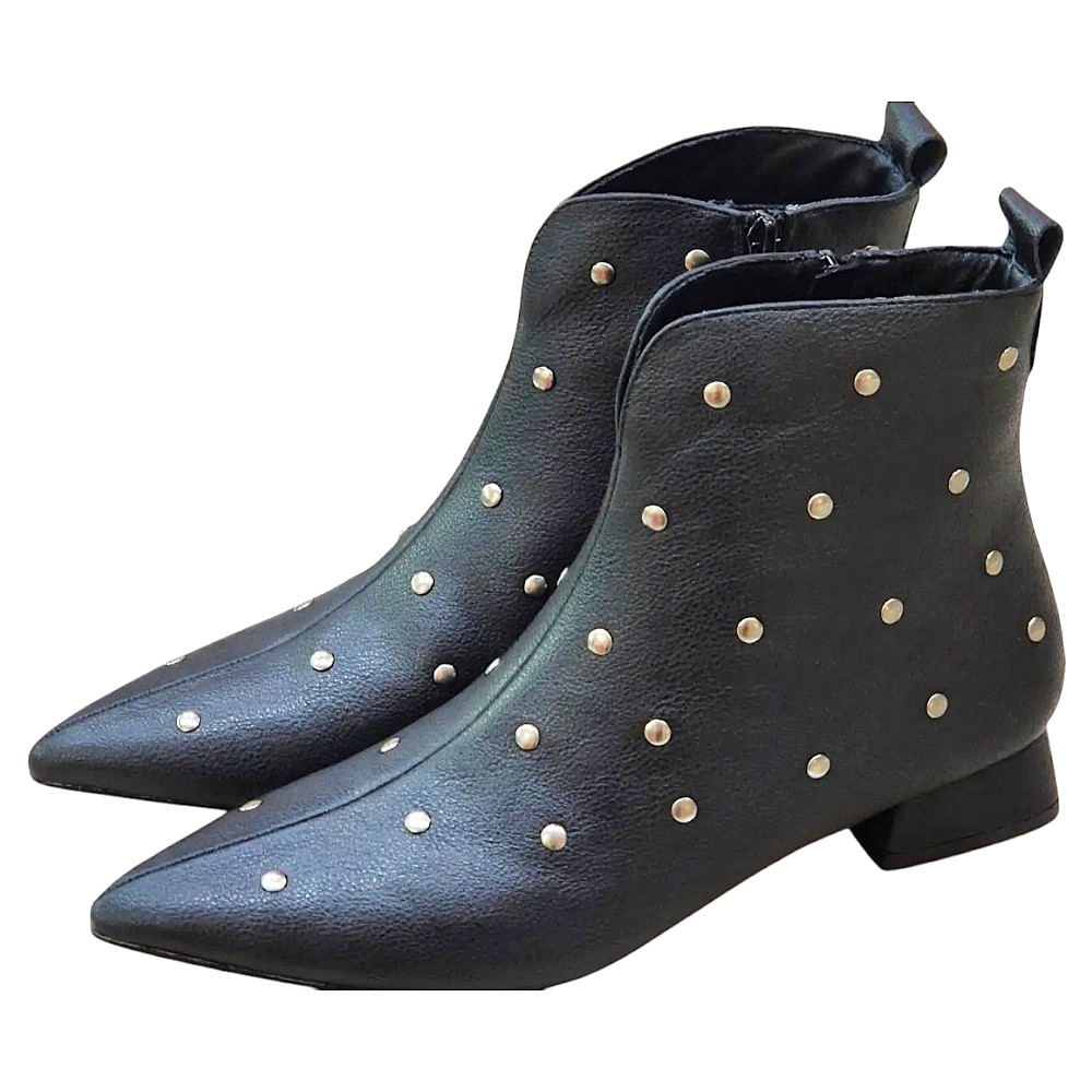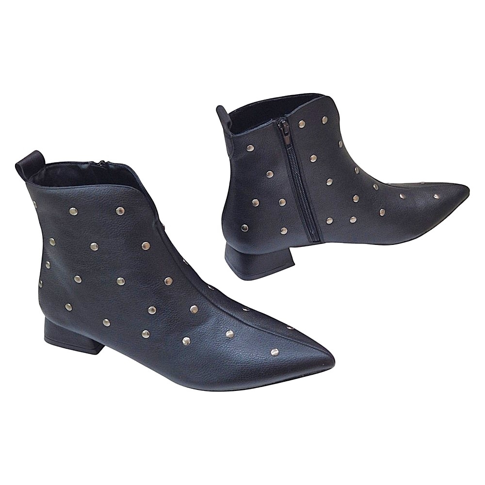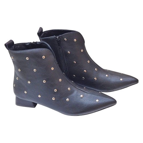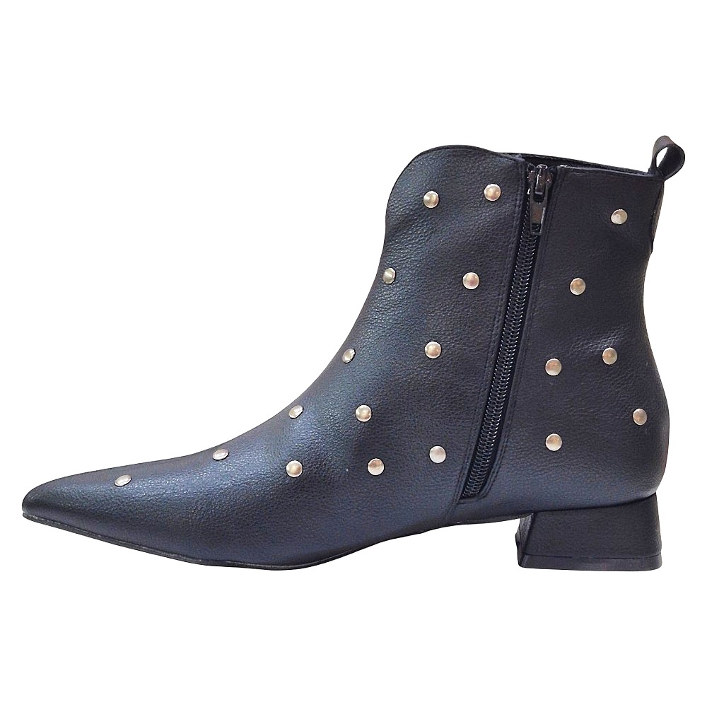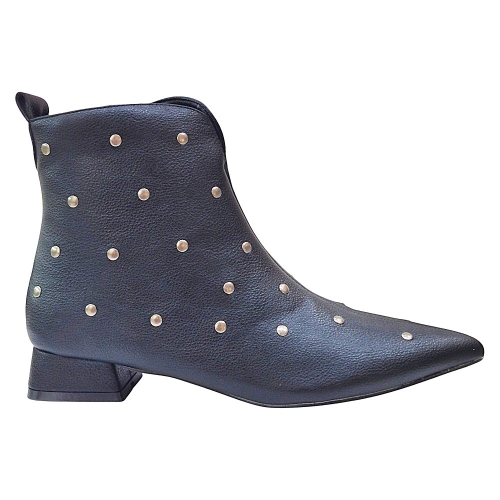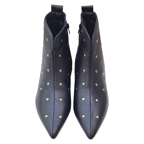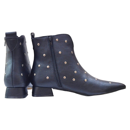 Los botines se realzan con una distribución de tachuelas plateadas que les dan un toque distintivo. Las tachuelas están colocadas de forma estratégica para crear un patrón asimétrico y chic que capta la luz. Cuentan con una práctica cremallera lateral para que sean fáciles de poner y quitar, y un tacón bajo de bloque que proporciona una ligera elevación sin sacrificar la estabilidad. La pequeña presilla en la parte trasera del tobillo añade un detalle funcional y de estilo.