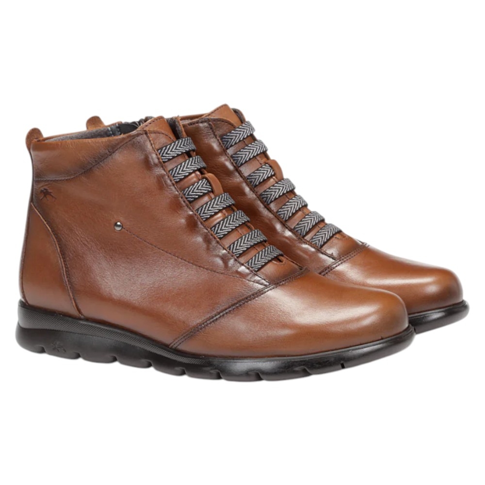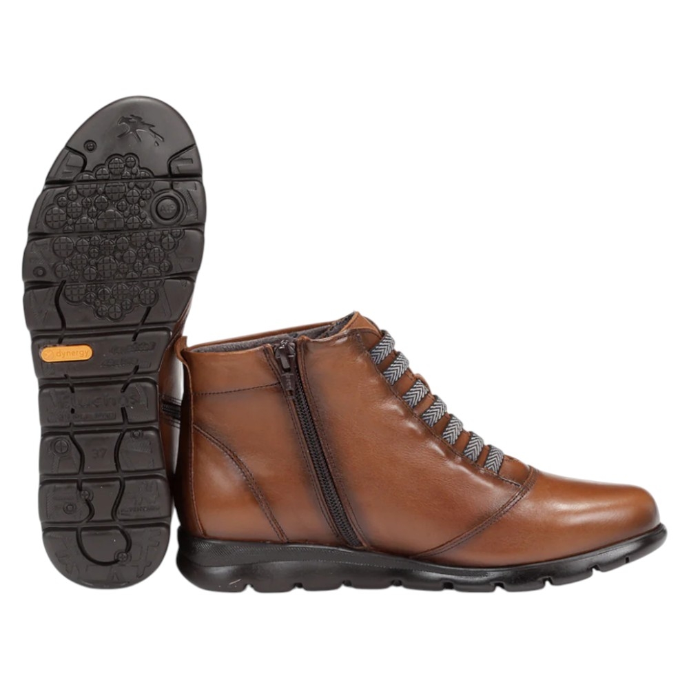 Con un diseño elegante en piel de color coñac, estos botines cuentan con cordones elásticos con un patrón de espiga en tonos grises y blancos, que aportan un toque moderno y deportivo. Además, incorporan una práctica cremallera lateral para un calce y descalce rápido y sencillo. La suela de EVA en color oscuro no solo es ligera, sino que también ofrece una excelente amortiguación.