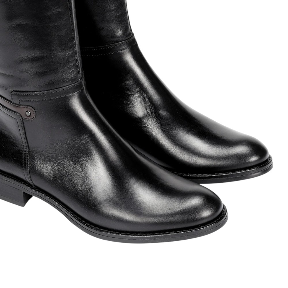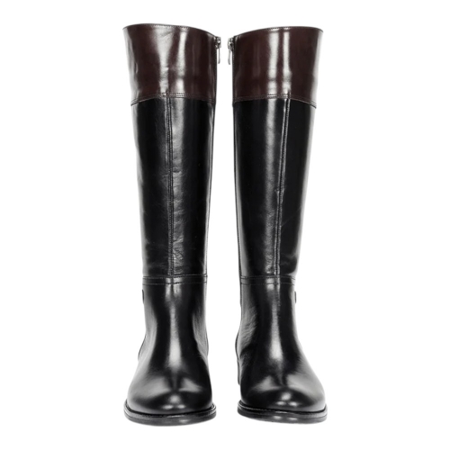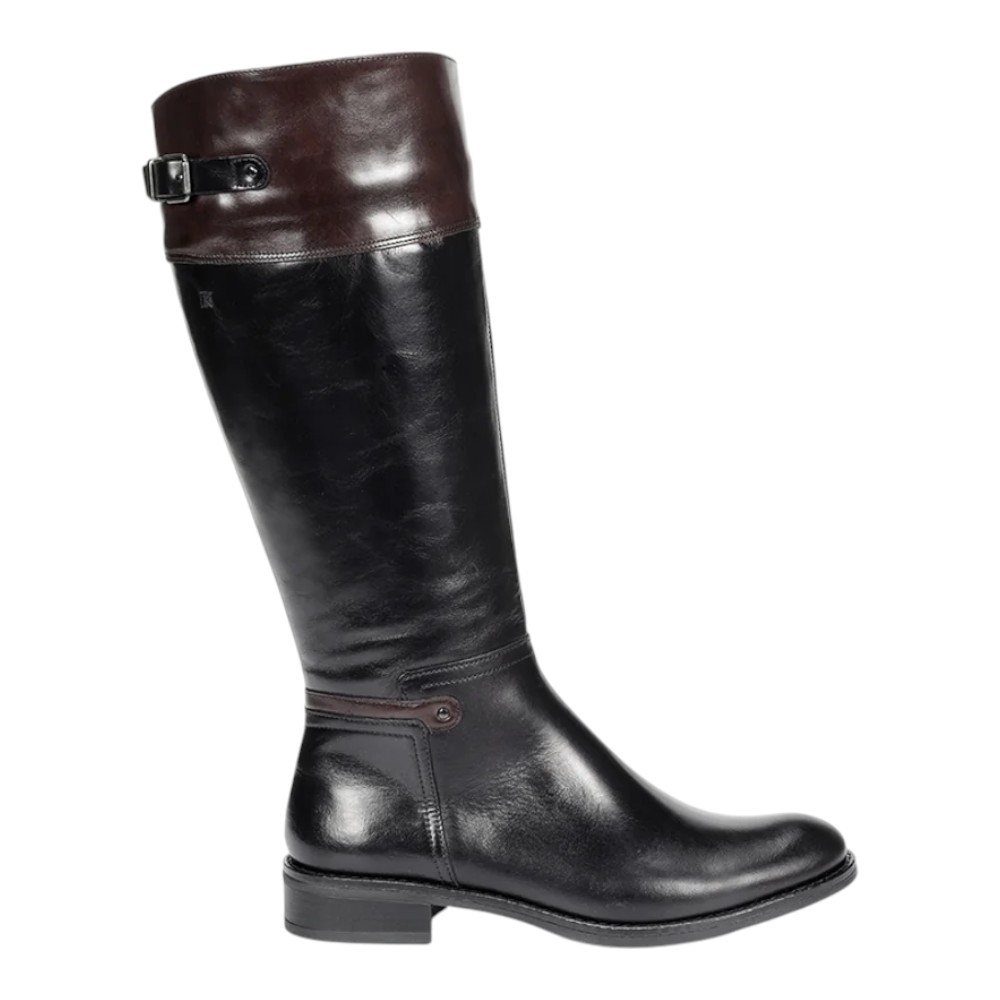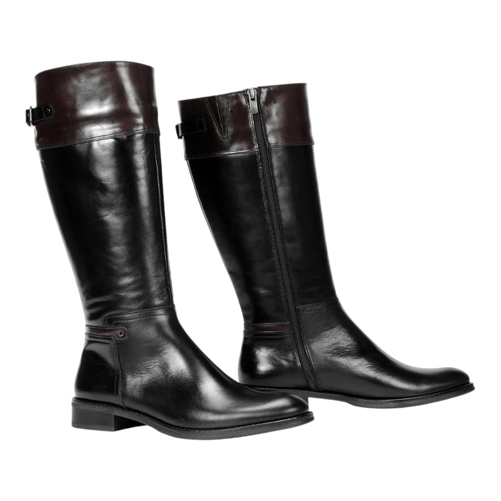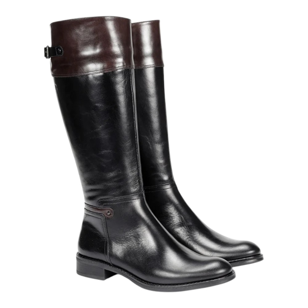 Diseño Bicolor: Combina el negro en el cuerpo de la bota con el tono marrón café en la parte superior de la caña.