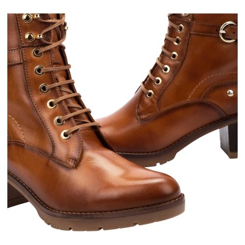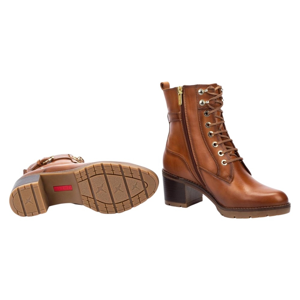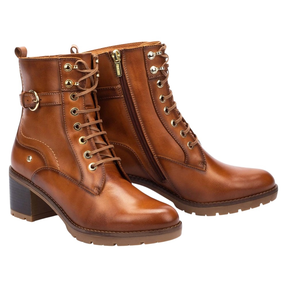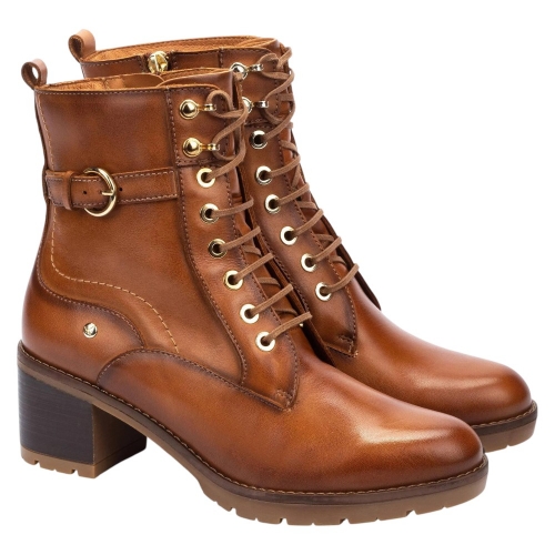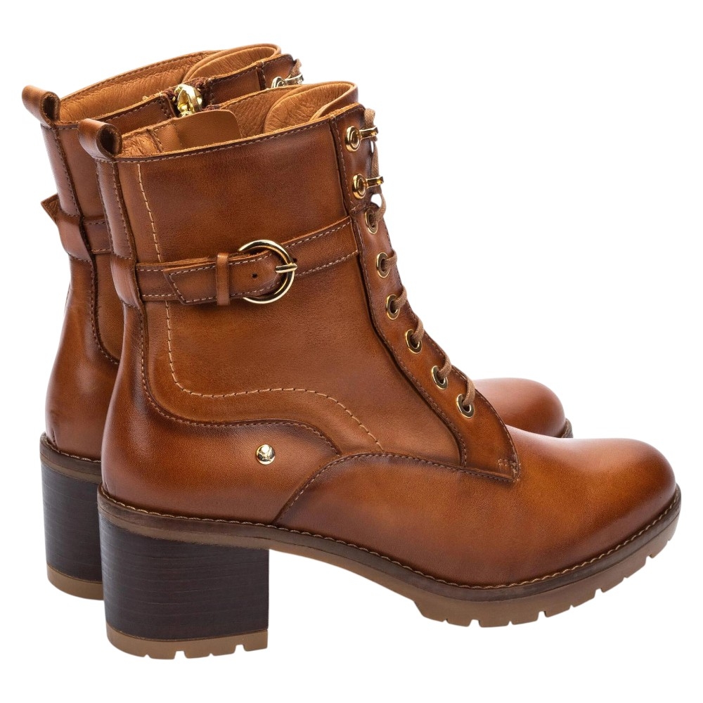El rico cuero de alta calidad en color brandy ofrece un aspecto sofisticado que combina perfectamente con una variedad de atuendos, desde vaqueros casuales hasta faldas y vestidos más elegantes. El intrincado diseño con cordones y ojales dorados añade un toque de encanto robusto, mientras que una práctica cremallera lateral asegura que sean fáciles de poner y quitar. El detalle de la hebilla ajustable y el sutil logo de Pikolinos en el tobillo añaden un toque final único.