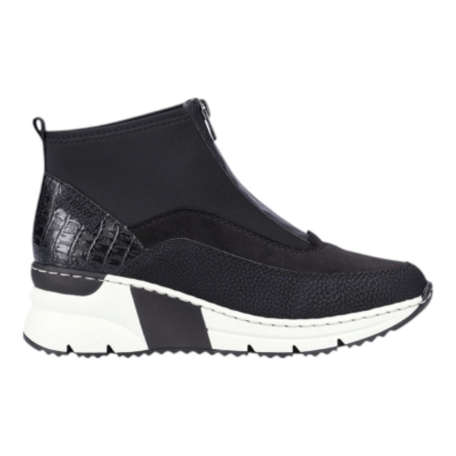 Zapato de mujer en forma de botín de la marca RIEKER, modelo N6352-00. Este moderno botín en color negro destaca por su diseño práctico y elegante, ideal para el día a día.