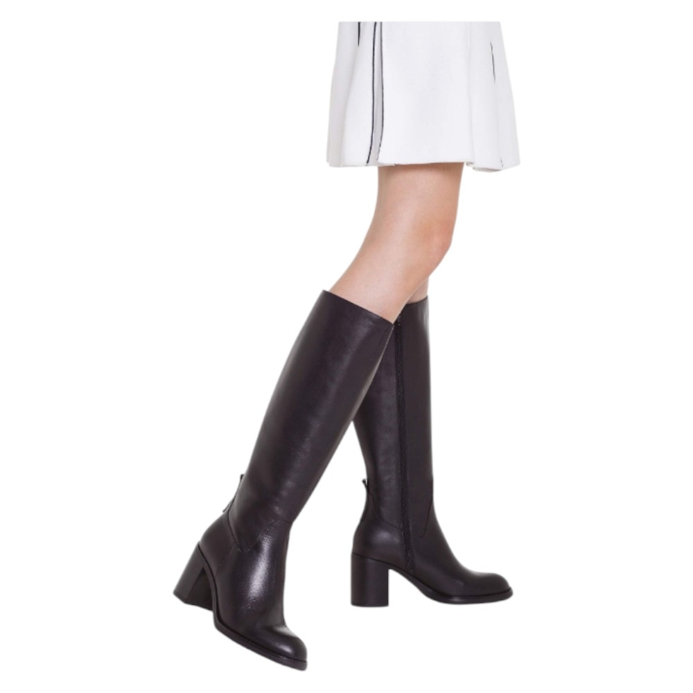 Estas botas de caña alta destacan por su diseño limpio y elegante, realzado por la suavidad de la piel lisa. Su silueta estructurada se ajusta delicadamente a la pierna, creando un look sofisticado y versátil, perfecto para cualquier ocasión.