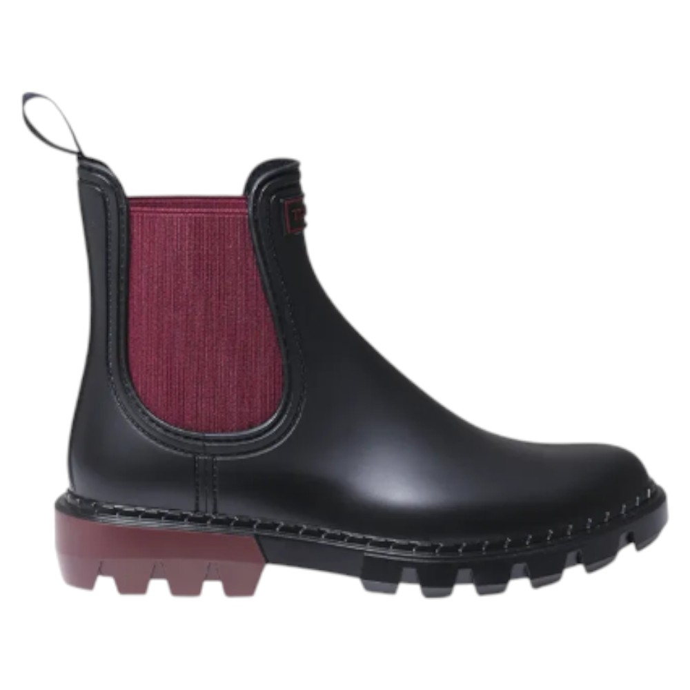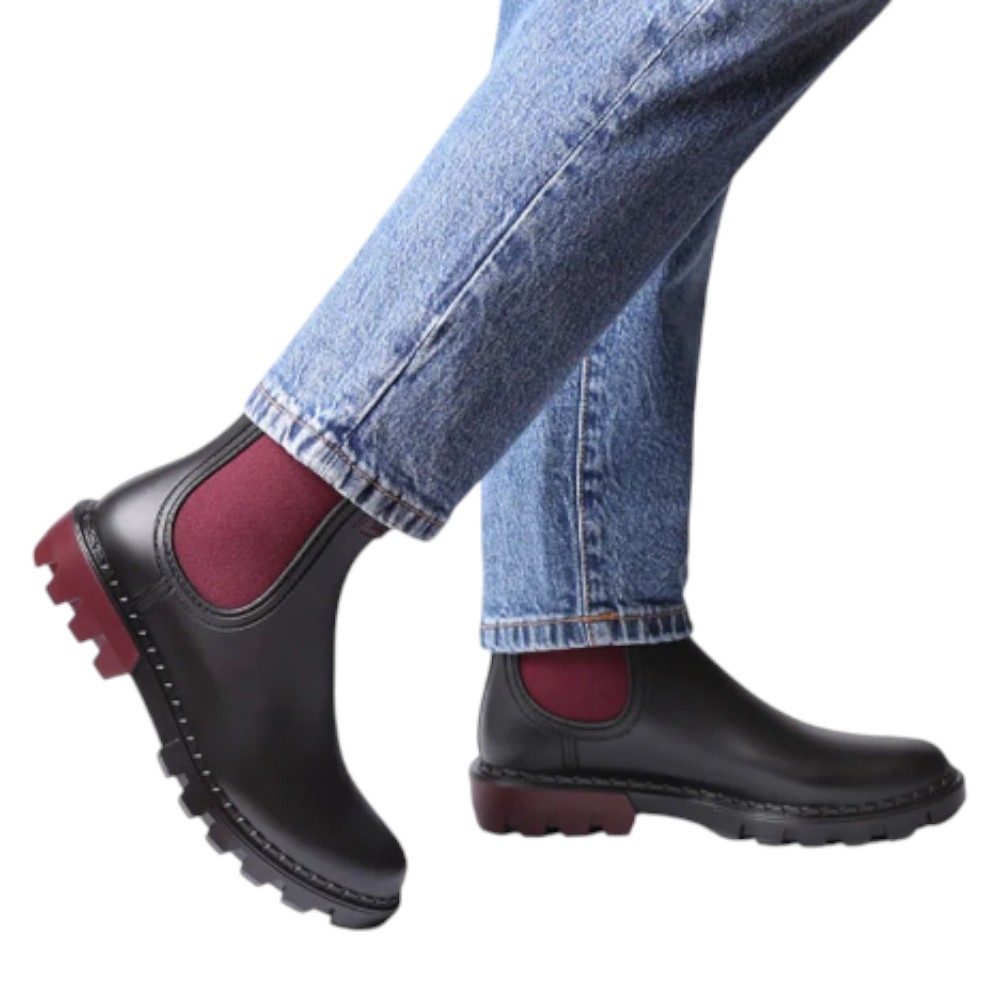 Contraste Sofisticado: La base de la bota en color negro elegante contrasta a la perfección con el detalle burdeos de las gomas laterales (estilo Chelsea) y la parte inferior de la suela. Los colores contrastados del talón y las gomas laterales le dan un toque original a este calzado.