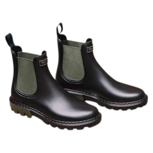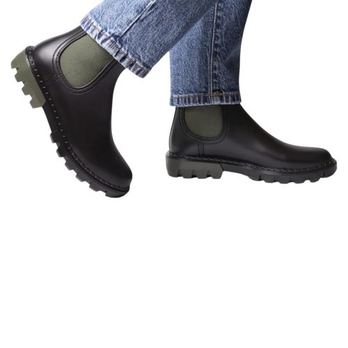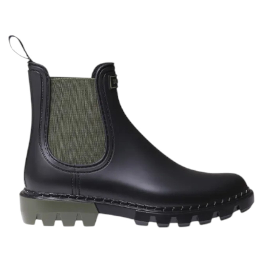 Este botín de agua para mujer está diseñado con el clásico estilo Chelsea, pero incorpora elementos contemporáneos que le dan un toque único. Su cuerpo principal es de un color fácilmente combinable, contrastando elegantemente con los detalles en Kaki. El color Kaki está presente en la banda elástica lateral de tejido estriado y en una sección de la base del talón, aportando un toque de originalidad y tendencia a este calzado.