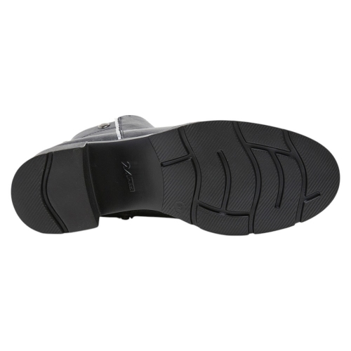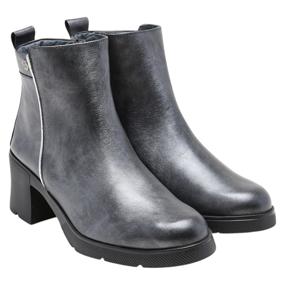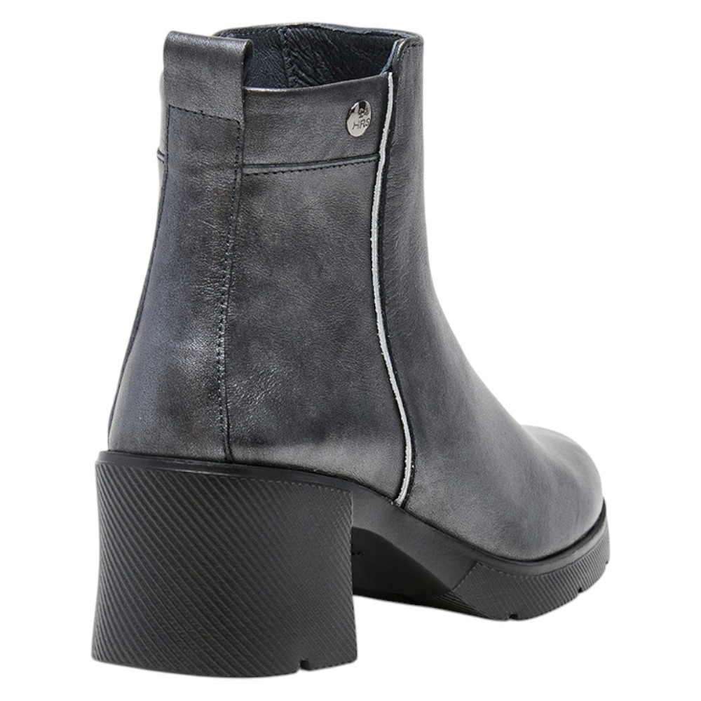 Este botín, confeccionado en piel de alta calidad, presenta un acabado único en tono antracita metalizado que le da un aspecto distintivo y versátil. El diseño cuenta con una franja lateral decorativa en color plata, un detalle sutil que añade un toque de brillo.