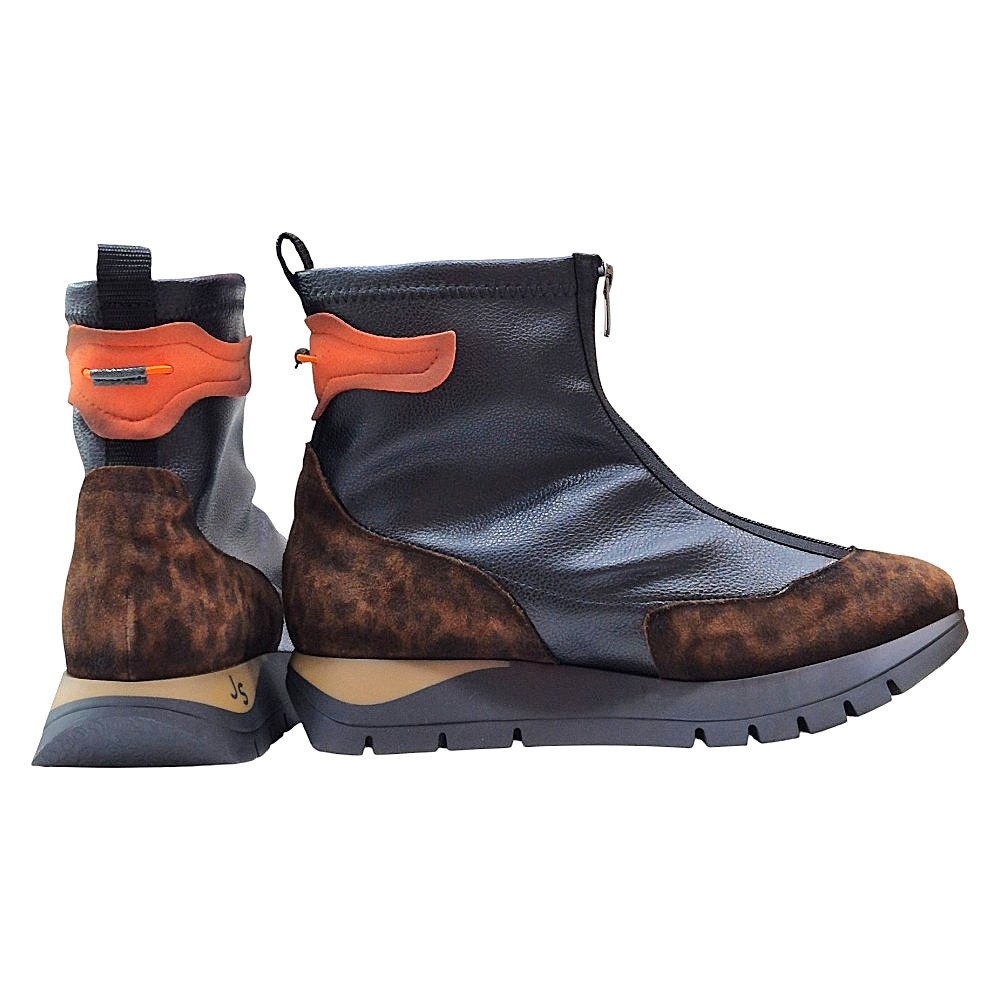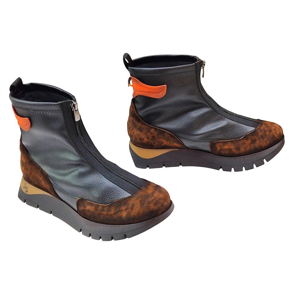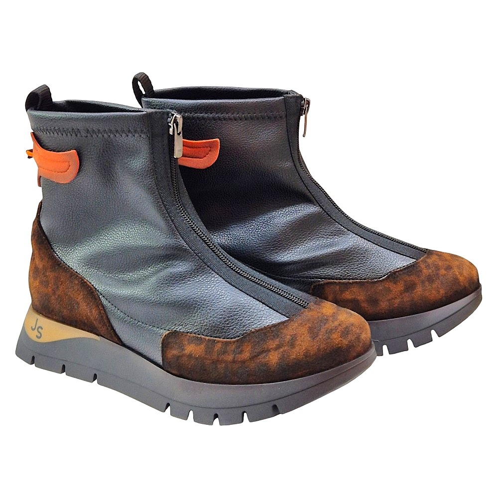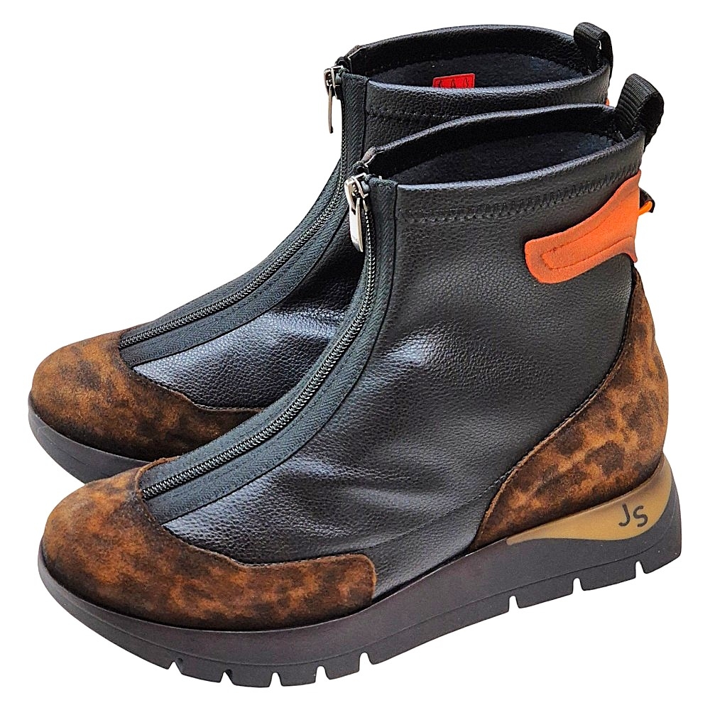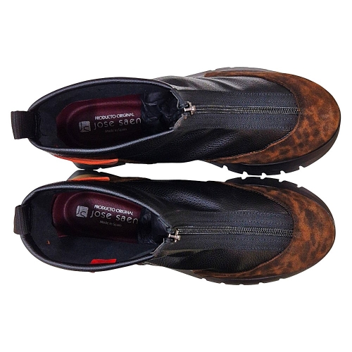 Detalles Adicionales: La parte trasera superior del botín incluye un práctico tirador de piel en un vibrante color naranja, un toque distintivo de la marca. El logo "JS" de Jose Saenz se encuentra discretamente grabado en el lateral de la suela.