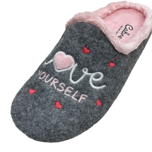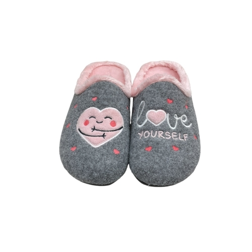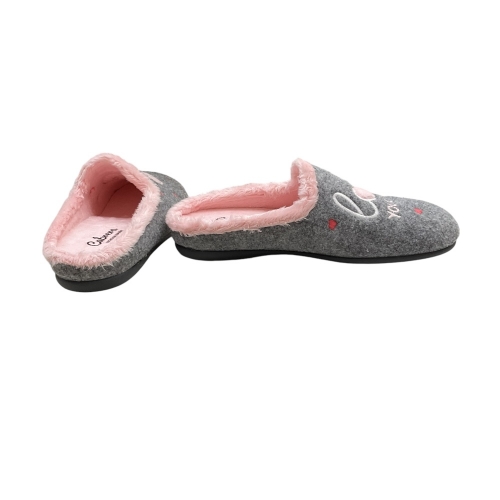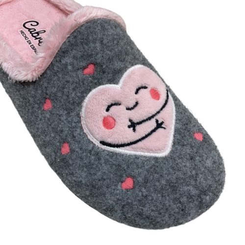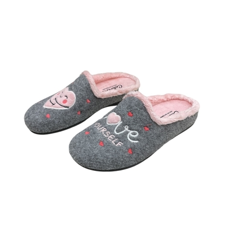 Zapatillas de casa destalonadas planas con plantilla extraíble, para el invierno en gris estampadas con planta y forro rosa muy suave, fabricadas en España