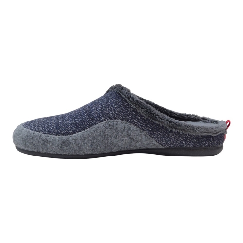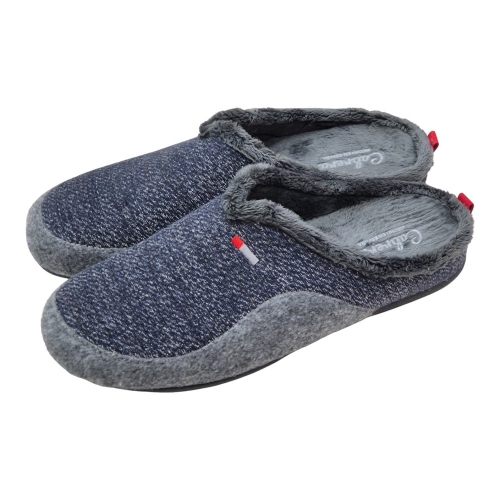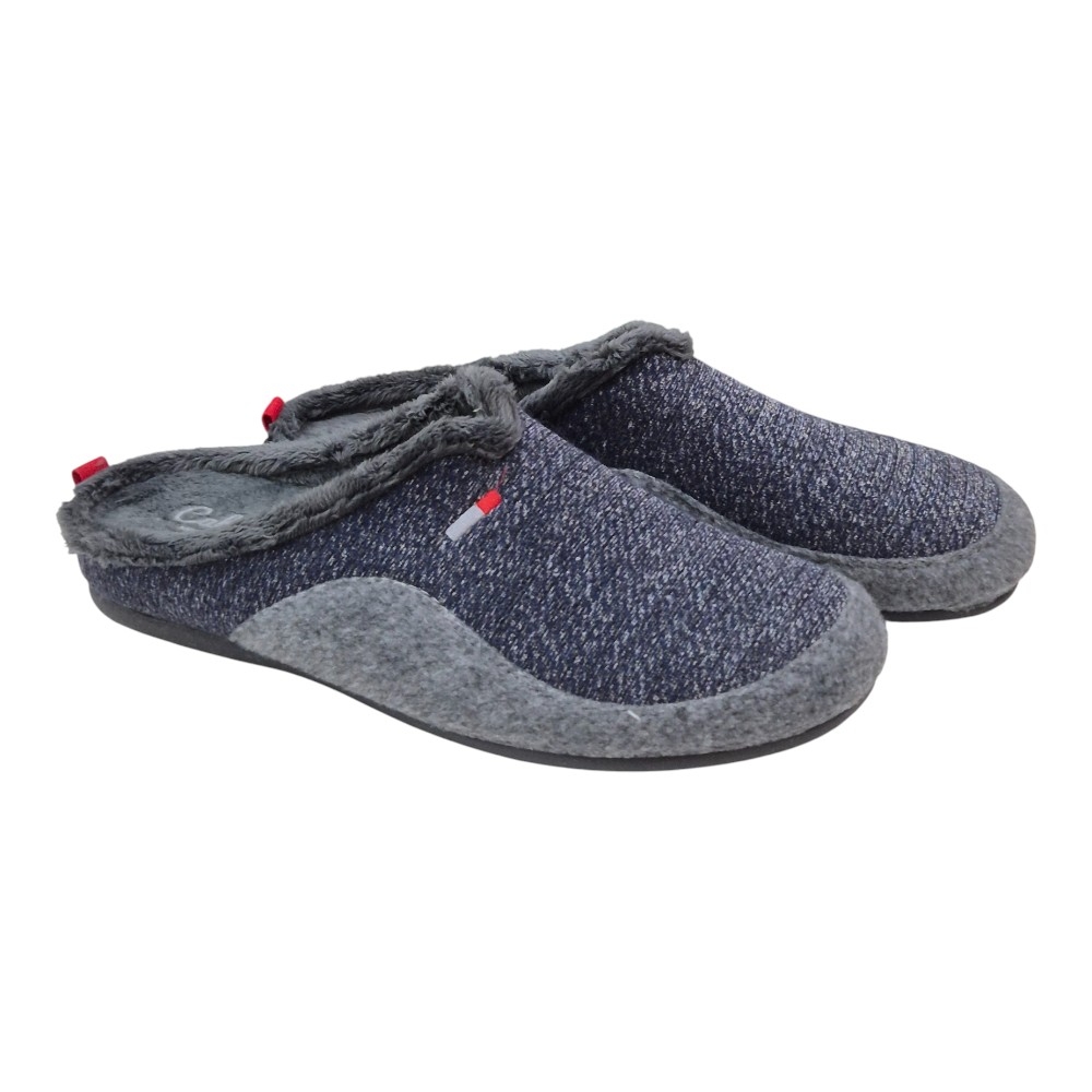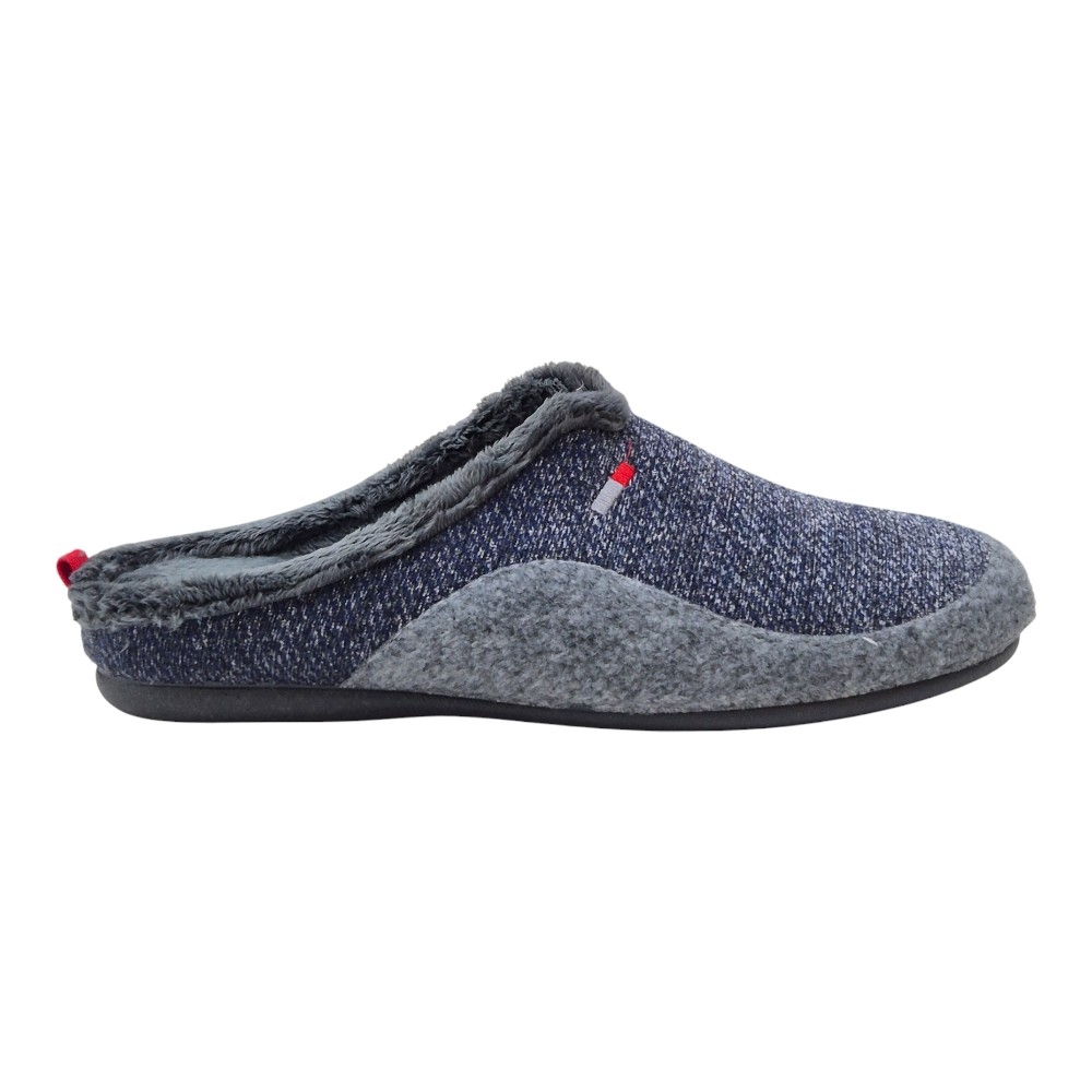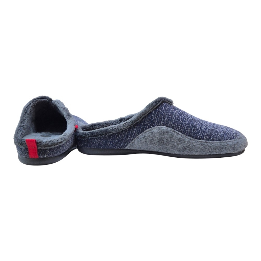 Exterior: La parte superior (pala) combina un tejido de punto trenzado de aspecto moderno en tonos Azul Marino y gris oscuro (melange), con una banda lateral de fieltro suave en color gris jaspeado.