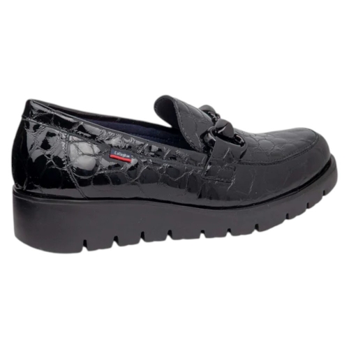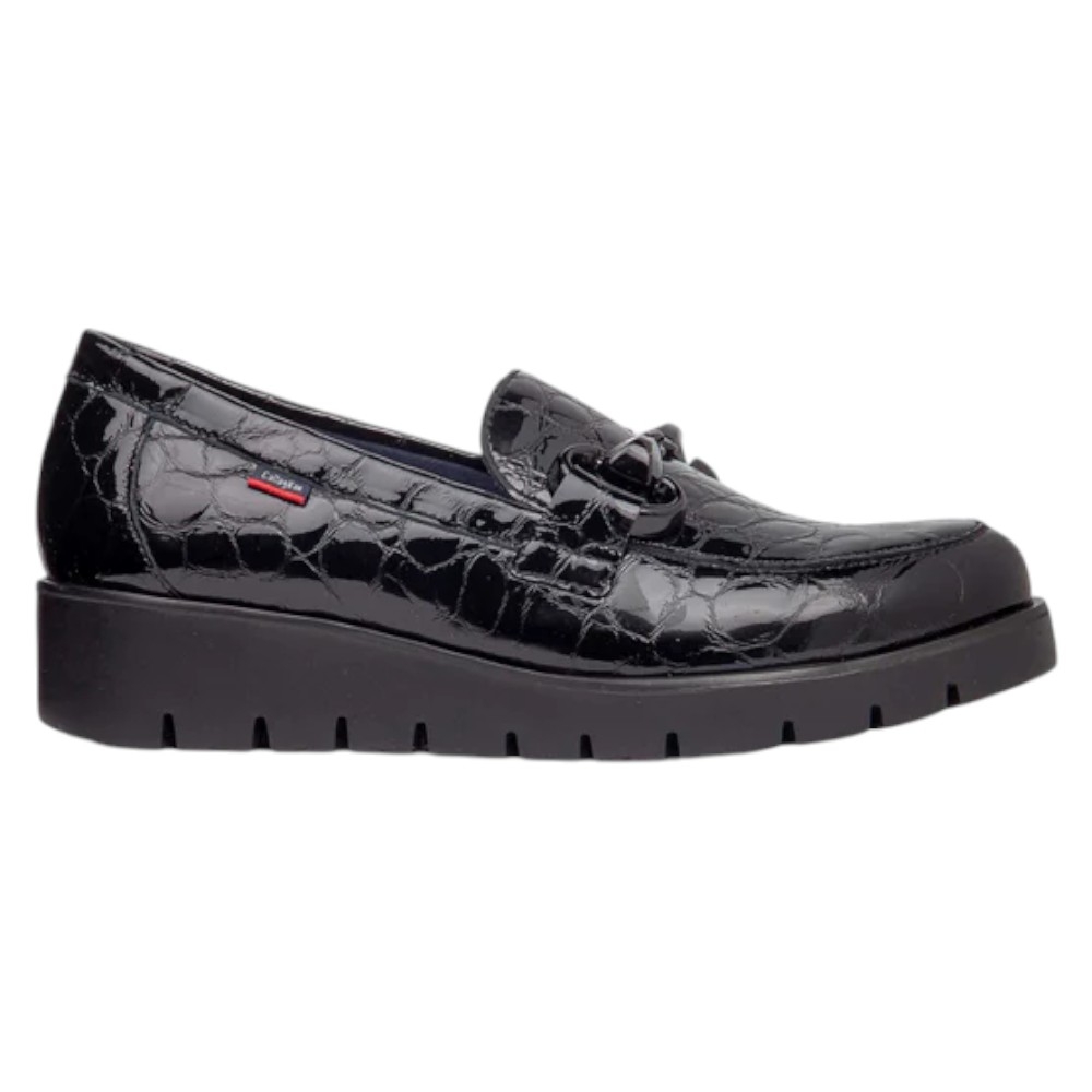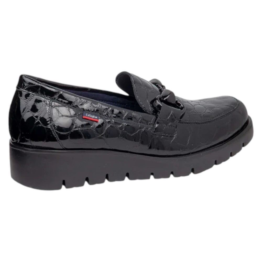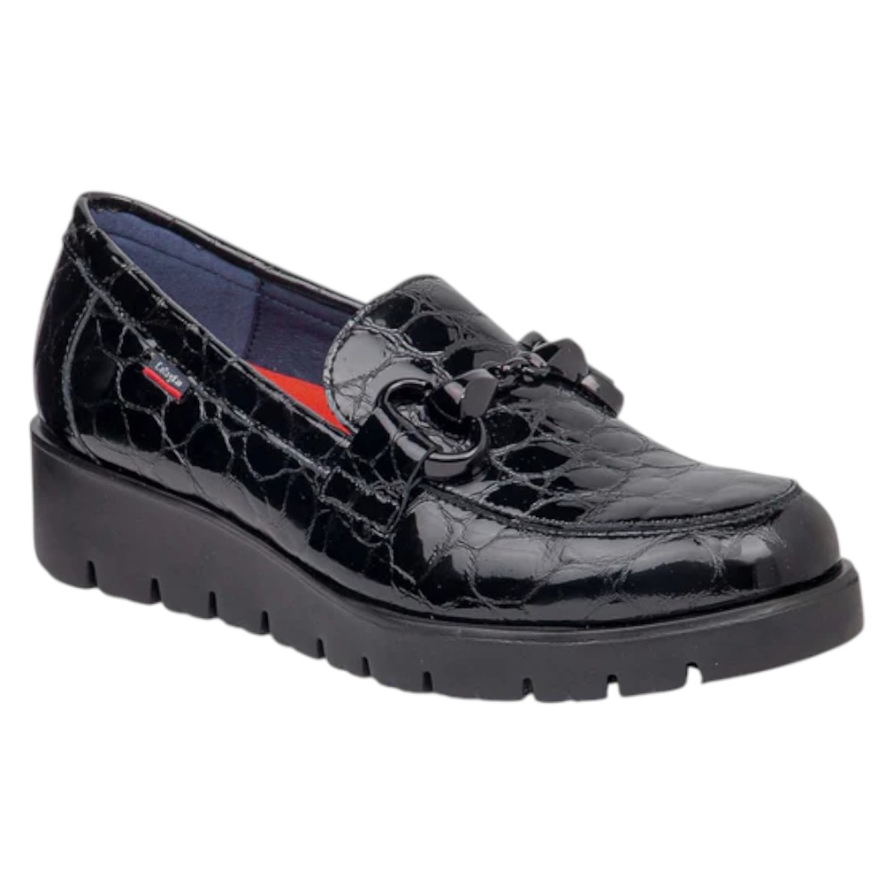 Diseño Sofisticado: Con un acabado en patente de efecto cocodrilo brillante en color negro ("Creta/Negro"), estos mocasines aportan un toque de distinción y moda a cada paso. El detalle de herraje en el empeine realza su estilo clásico y atemporal.