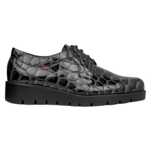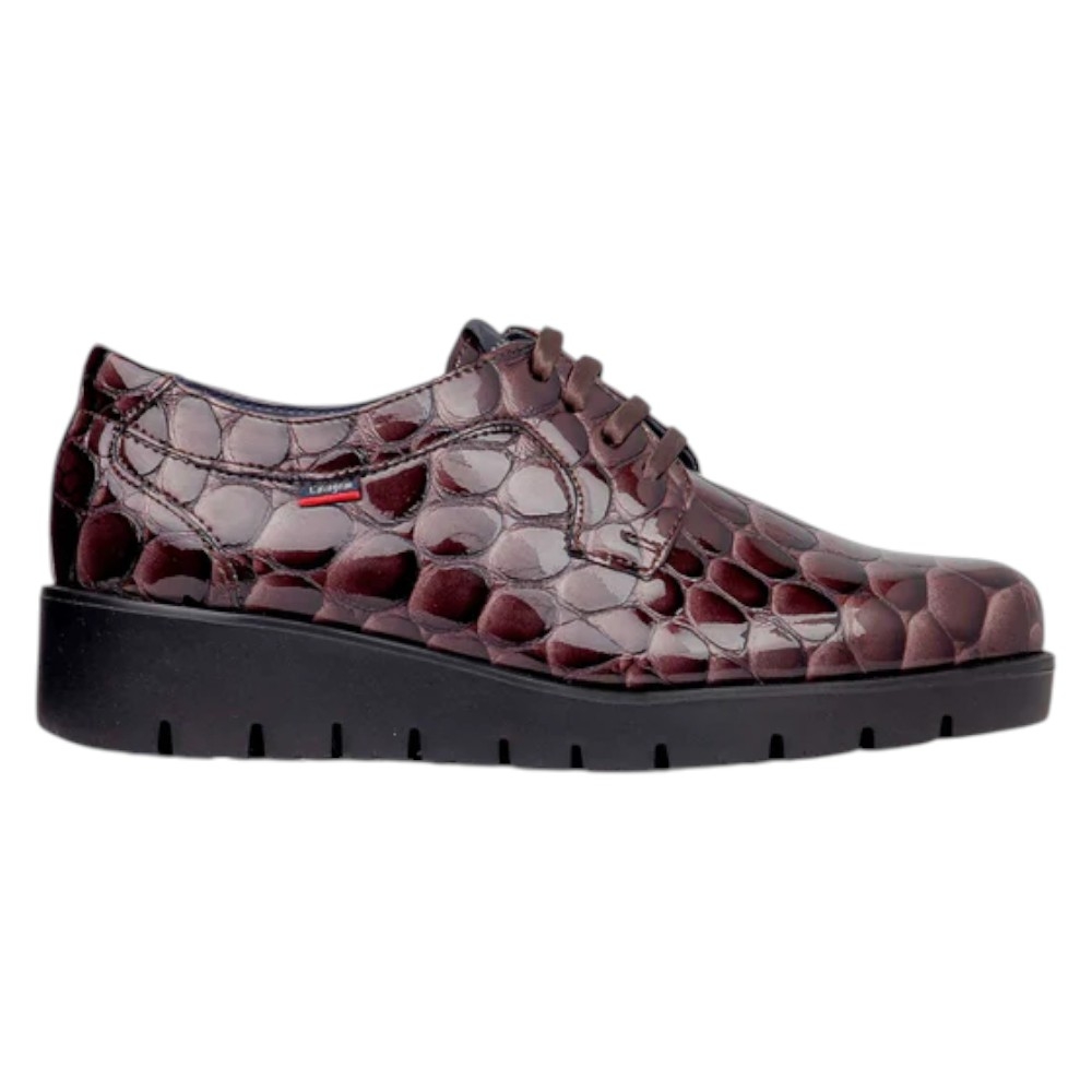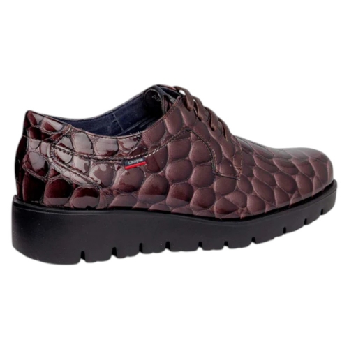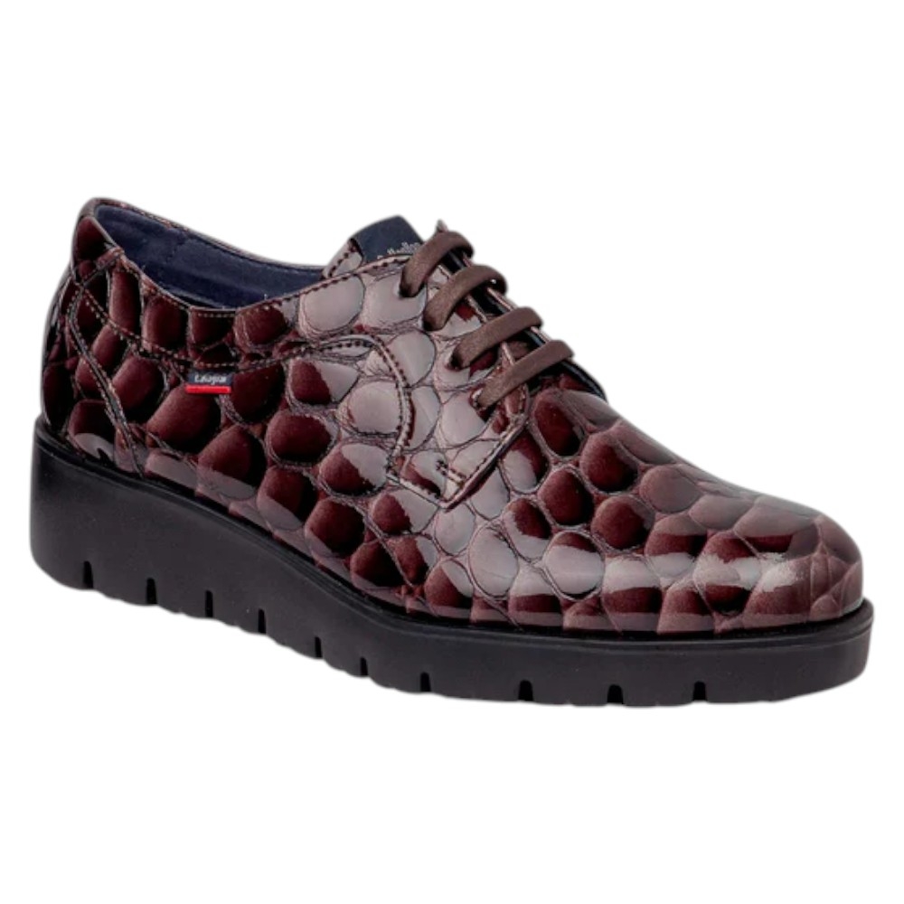 Descubra la perfecta unión entre elegancia moderna y el máximo confort con el zapato Callaghan 58515. Un modelo tipo blucher con cordones que destaca por su diseño sofisticado en piel natural con un distintivo acabado acharolado y grabado de fantasía, que simula un efecto cocodrilo o similar, en un profundo tono marrón testa.
