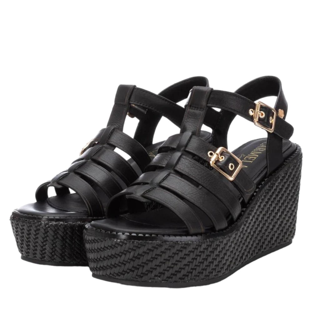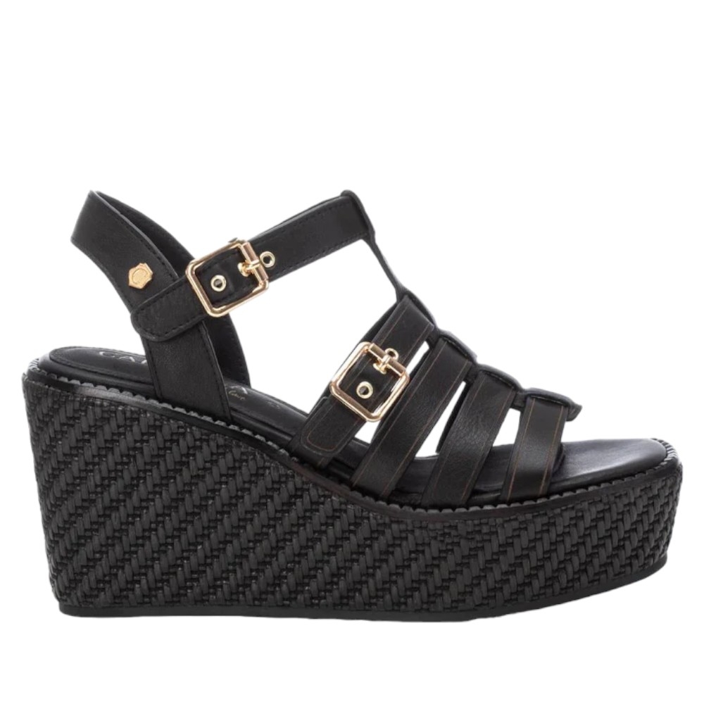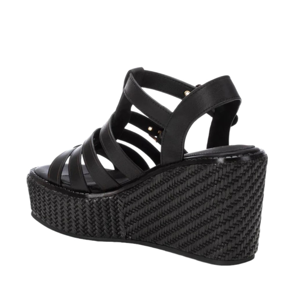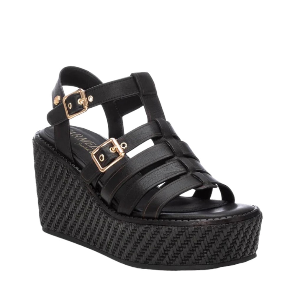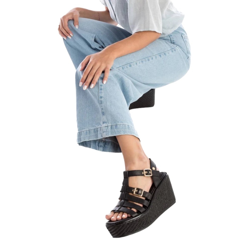 Modelo con tiras cruzadas y hebilla metálica decorativa en el frente.