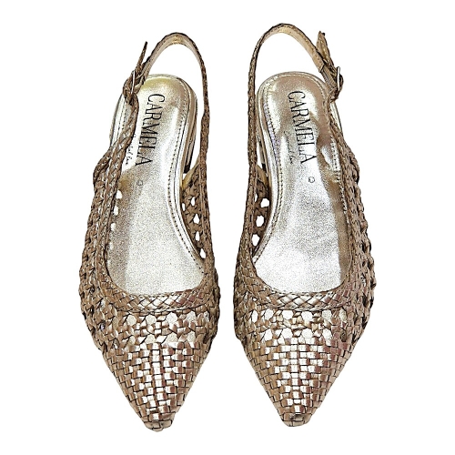 Bailarina de mujer, marca Carmela. Fabricada en piel de alta calidad, diseño trenzado con acabado metalizado. Cierre mediante correa al tobillo con hebilla. Suela de goma antideslizante.