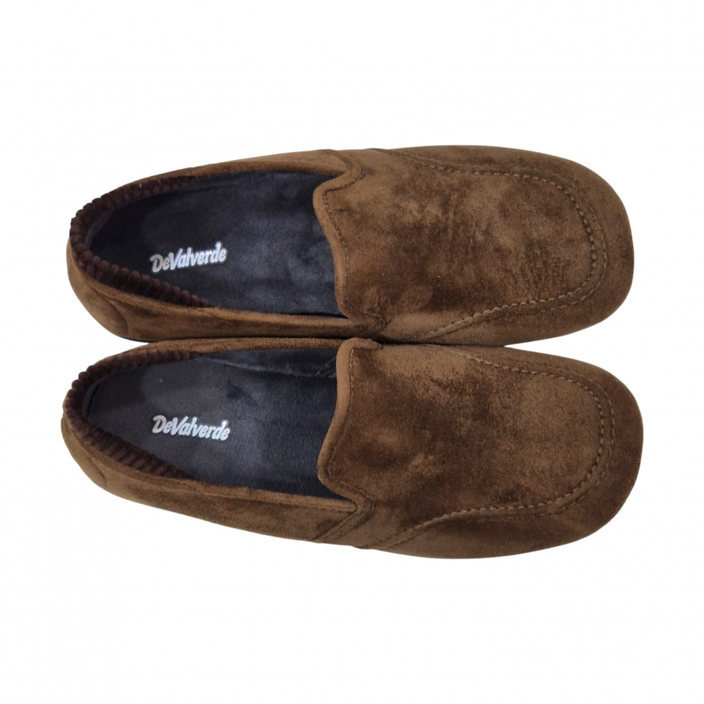 El interior está completamente forrado con un tejido cálido y agradable al tacto, garantizando una temperatura confortable para el pie. En la plantilla interior se destaca claramente el nombre de la marca, DeValverde, sinónimo de calidad en calzado de descanso.