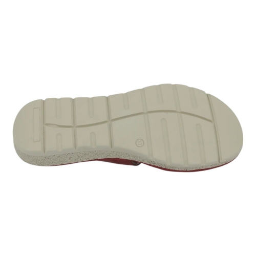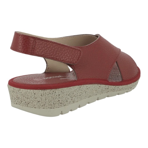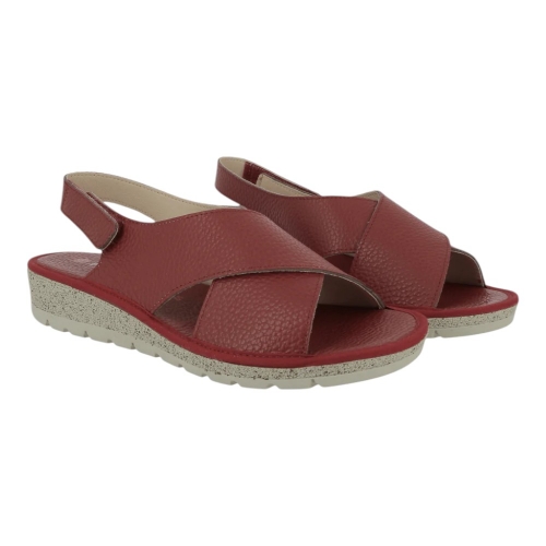 Sandalia de cuña para mujer de piel en color rojo. Diseño de tiras anchas cruzadas, cierre de velcro, plantilla de piel y suela de goma ligera y flexible.