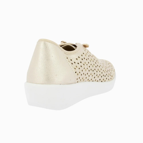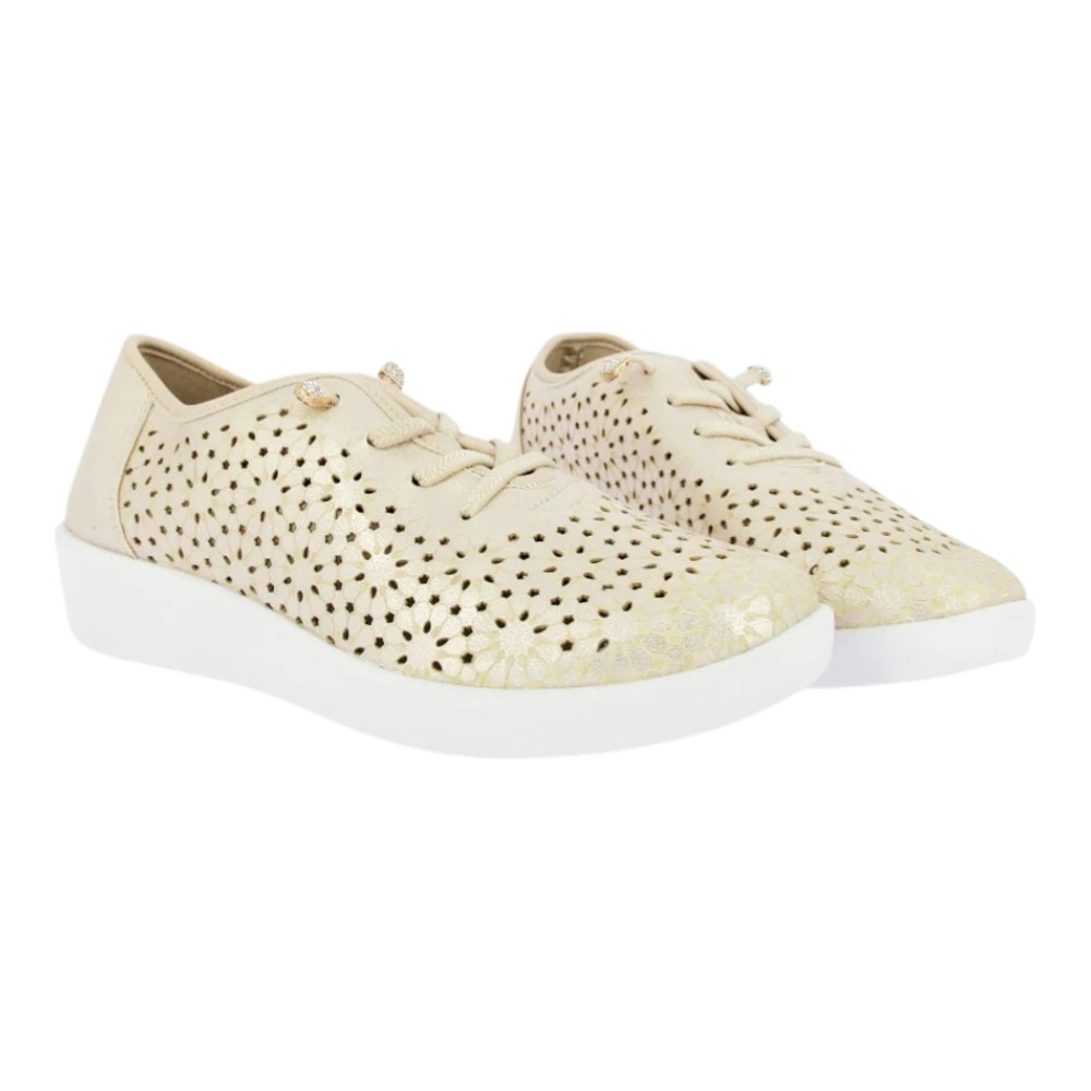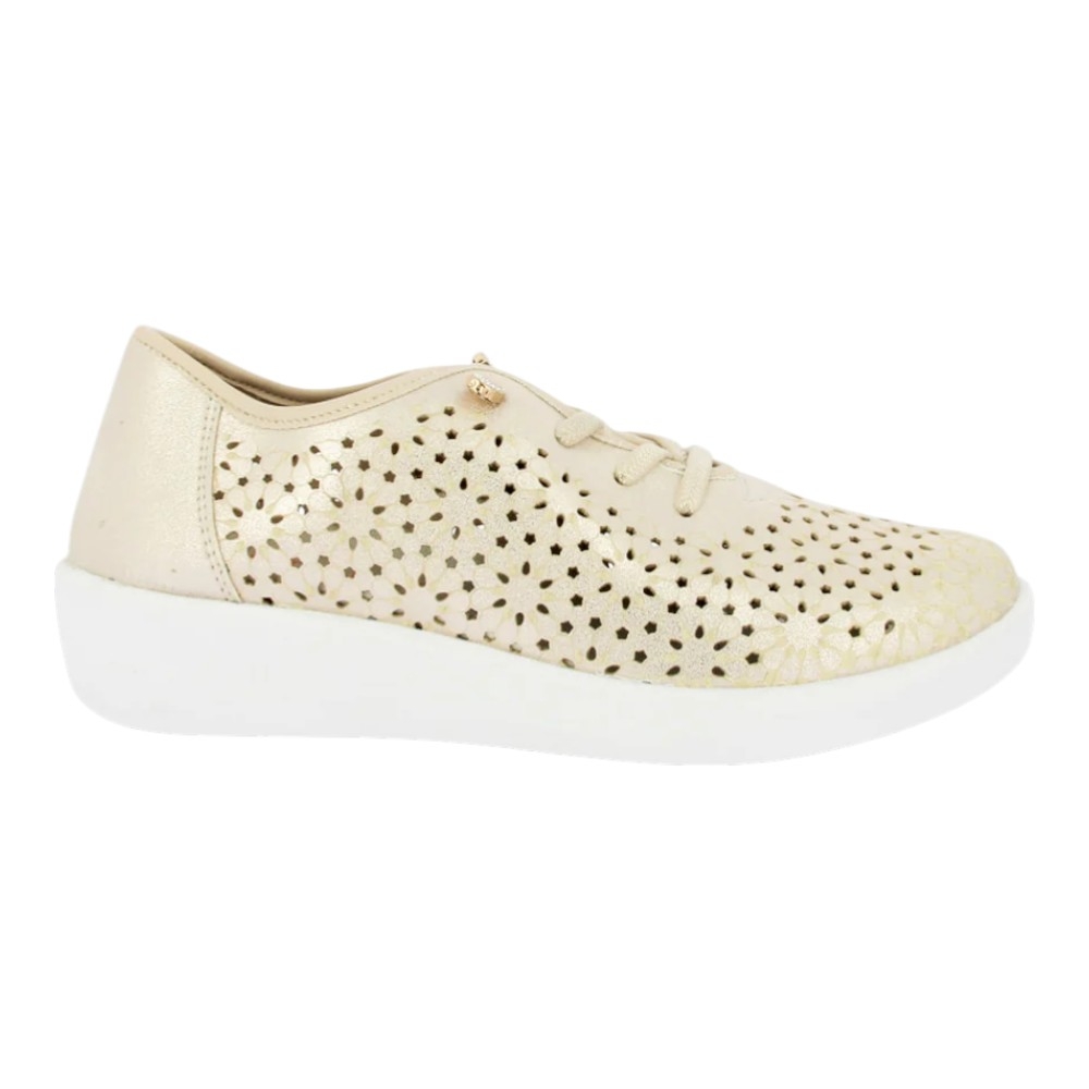 Su acabado en color champagne con destellos dorados aporta una luminosidad elegante que combina con cualquier outfit primaveral o veraniego. El diseño exterior destaca por sus picados láser en forma floral, que no solo añaden un detalle estético único, sino que garantizan una ventilación constante para mantener tus pies frescos incluso en las jornadas más calurosas.