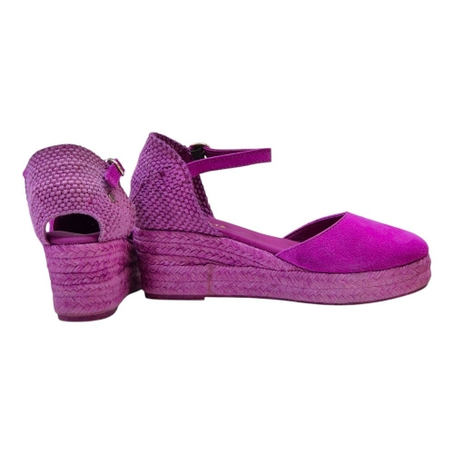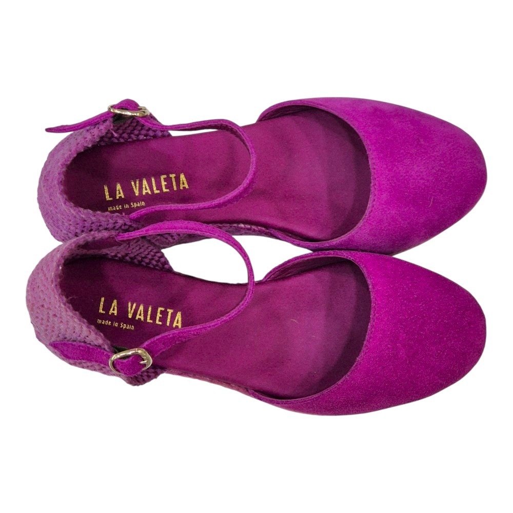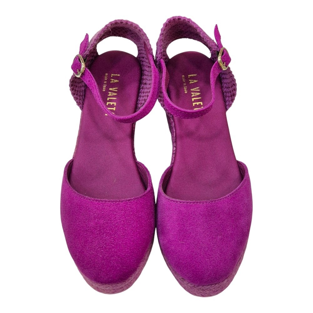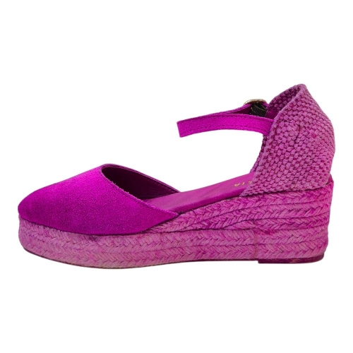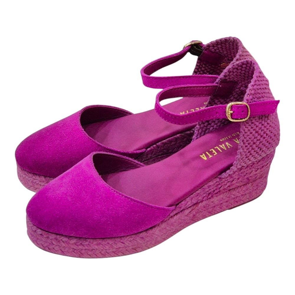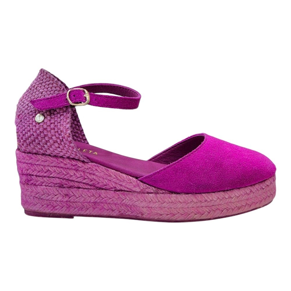 La suela, elaborada en yute natural de color fucsia, aporta un toque auténtico y sofisticado. La cuña baja de 3 cm ofrece la elevación perfecta para estilizar la figura sin sacrificar la comodidad, convirtiéndolas en la opción ideal para el día a día o para ocasiones especiales donde el confort y el estilo son primordiales.