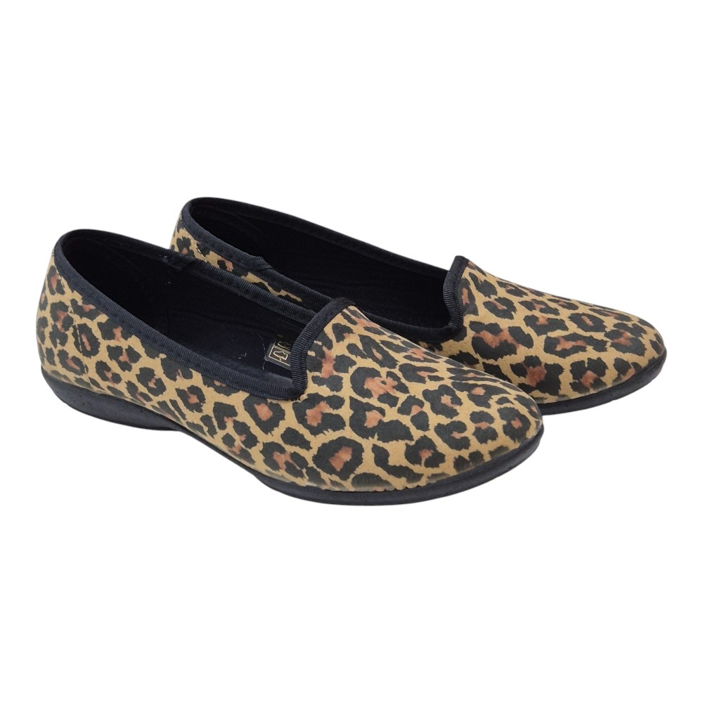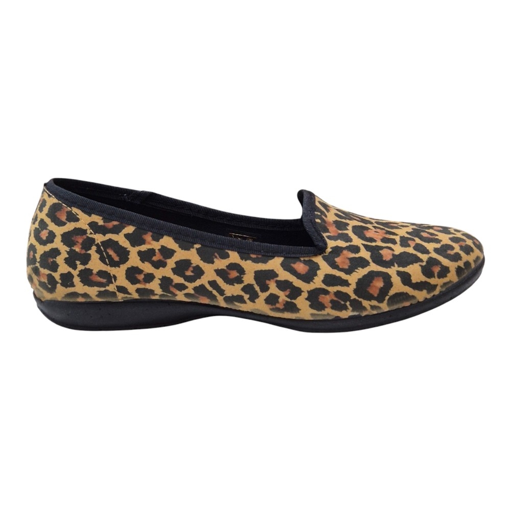 El modelo 774 destaca por su acabado en tela de alta calidad con un patrón de leopardo en tonos tierra, ocres y negros, una tendencia atemporal que eleva cualquier outfit básico. Su silueta de escote redondo y ribete textil al tono proporciona un ajuste suave al pie, evitando rozaduras y garantizando una elegancia discreta.