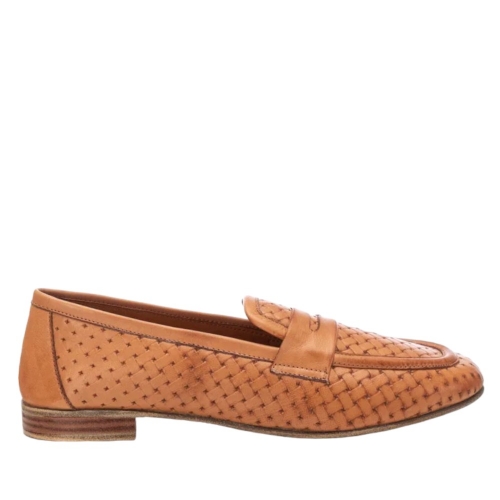Chequea estas manoletinas planas de cuero color cuero con antifaz estilo mocasín diseñadas por Carmela.