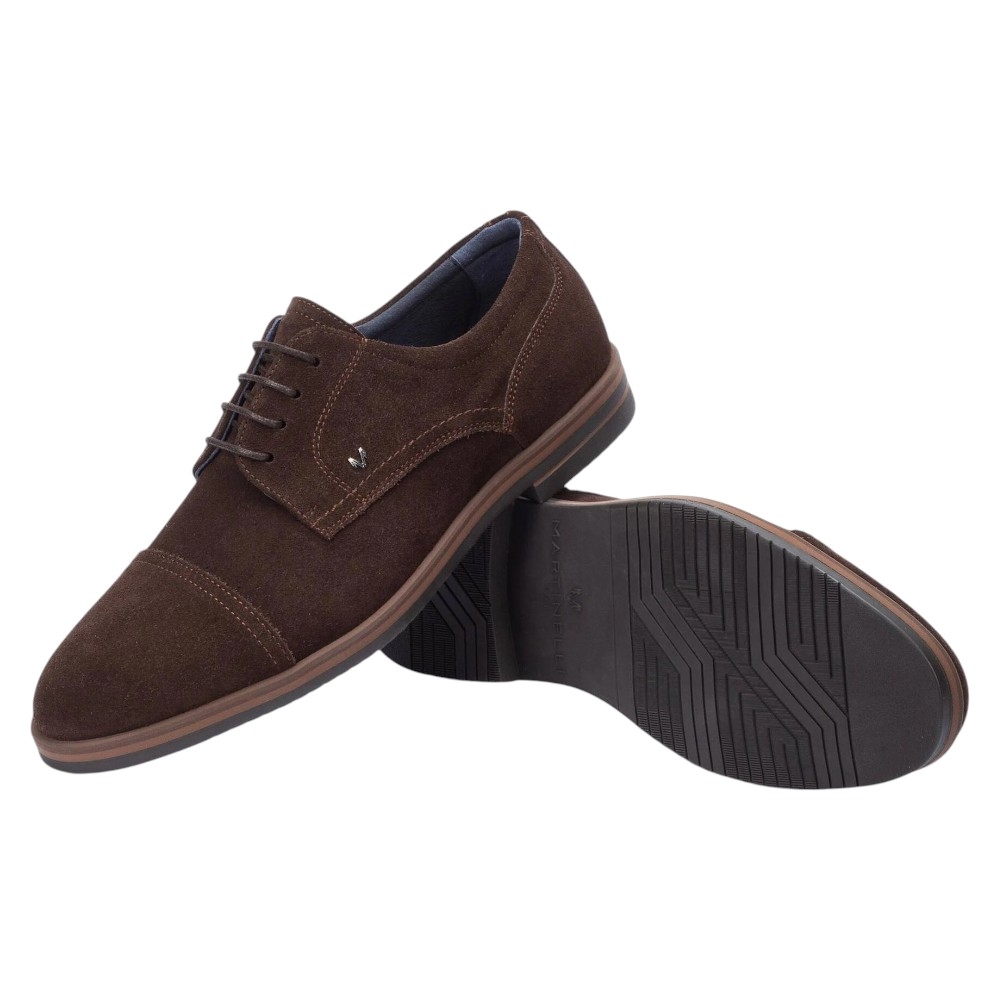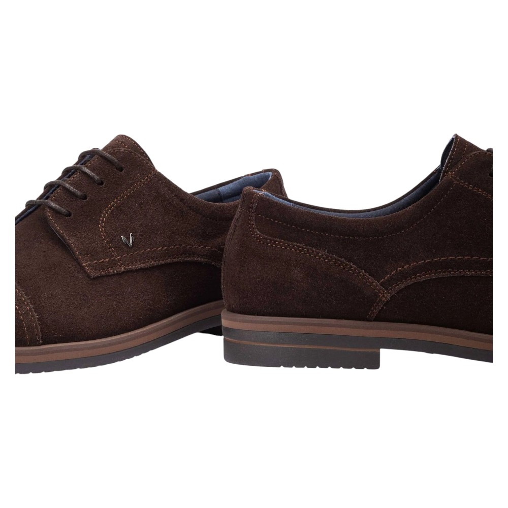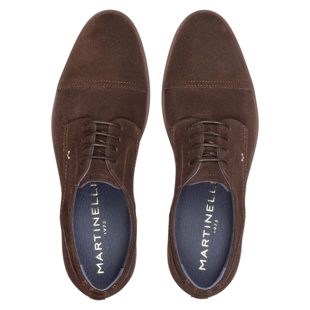 Estos zapatos son los Martinelli Douglas en color marrón oscuro. Son un calzado de hombre de estilo blucher con punta almendrada, diseñados para ofrecer comodidad y un toque de elegancia moderna para el día a día.