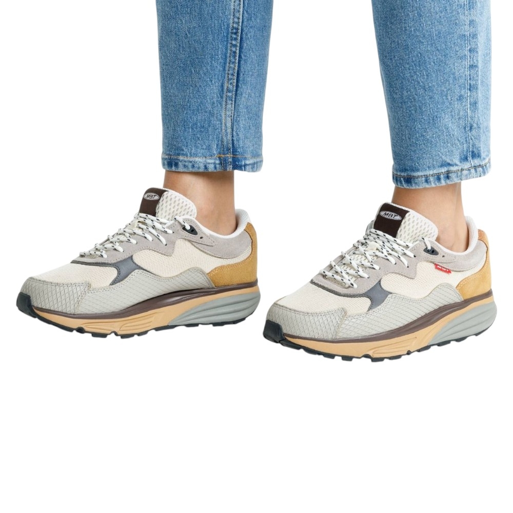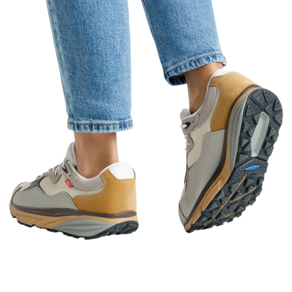 Las zapatillas MBT Narita W en color Tan combinan un estilo retro-deportivo contemporáneo con la tecnología biomecánica patentada de MBT, diseñada para ofrecer bienestar y fitness en cada paso. Son la elección ideal para quienes buscan maximizar el confort, mejorar la postura y obtener una Alta Activación Muscular durante el uso diario.
