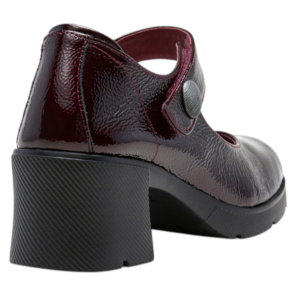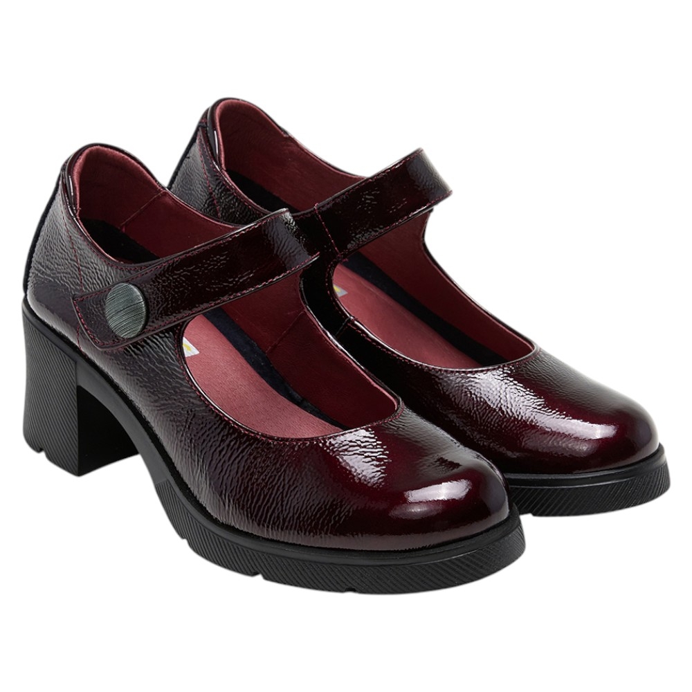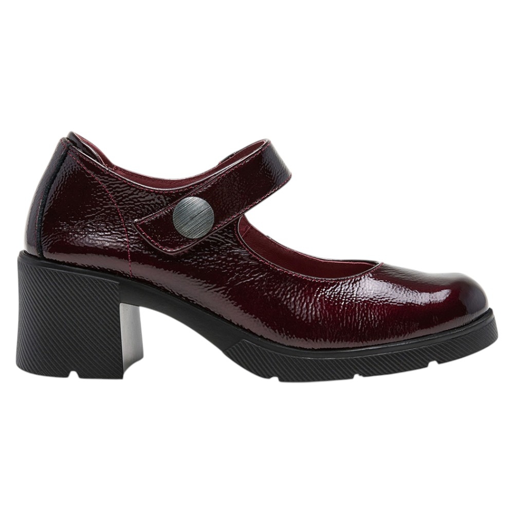Diseño Sofisticado: Con un acabado en charol de un profundo color Vino (Palak Vino), estas merceditas aportan un toque de brillo y sofisticación a cualquier conjunto. La correa superior con cierre de velcro no solo añade un detalle moderno, sino que también garantiza un ajuste seguro y práctico.