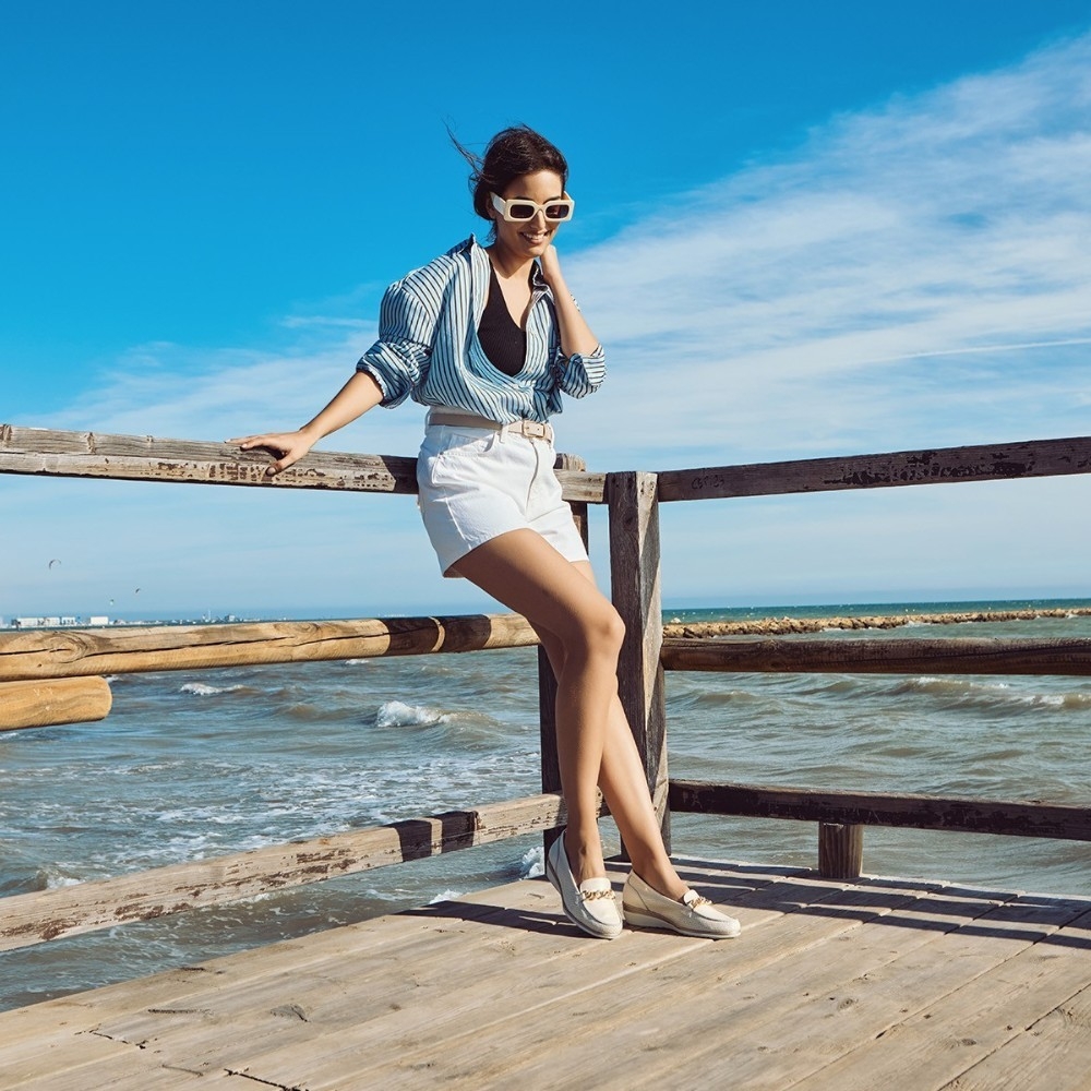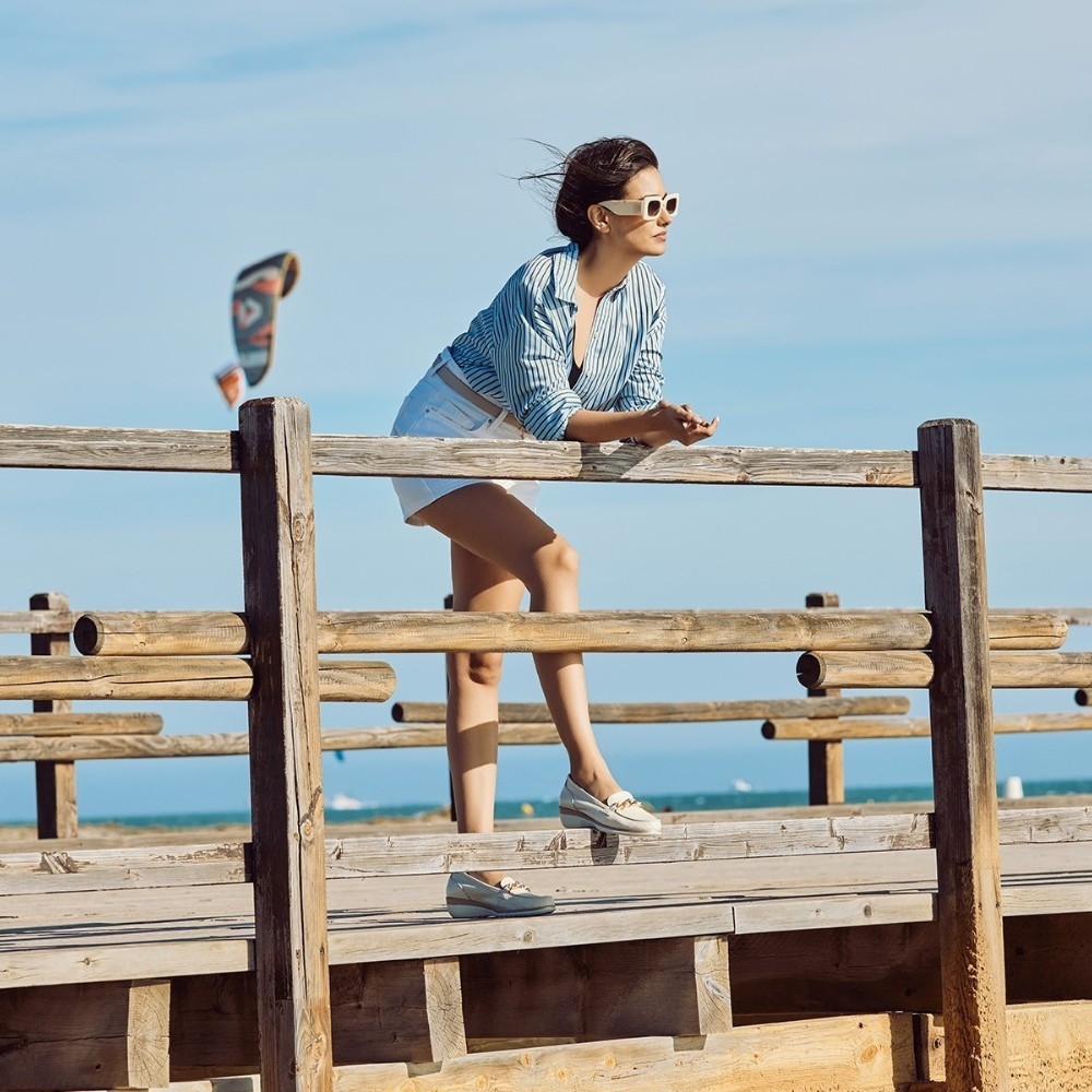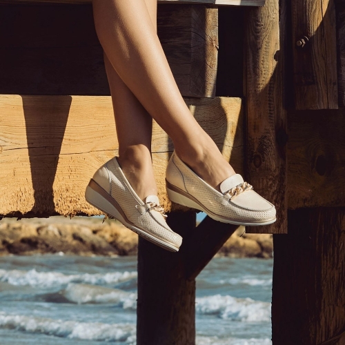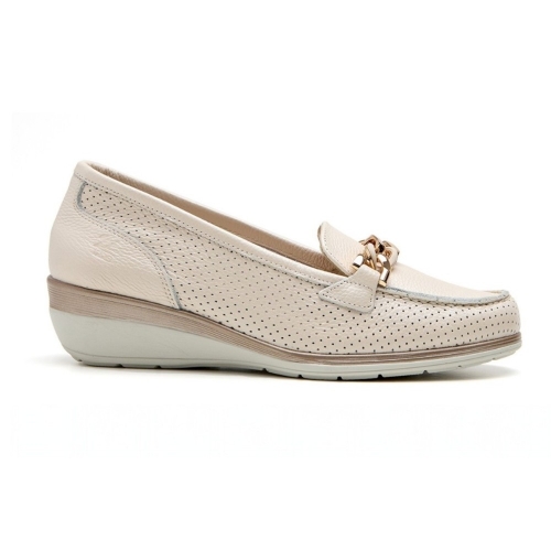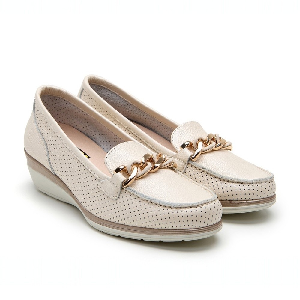 Este mocasín destaca por su acabado en piel de alta selección con una delicada textura perforada que favorece la transpiración y aporta ligereza visual. Su detalle de cadena metálica en el empeine eleva el diseño, convirtiéndolo en una pieza clave tanto para looks de oficina como para eventos casuales.