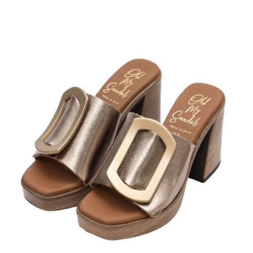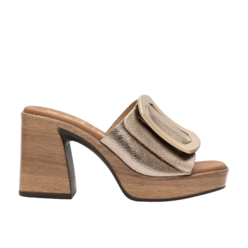 Sandalia de mujer con tacón fabricada en piel de color cava. El modelo Duna destaca por su pasador dorado decorativo y su tacón y plataforma que lo hacen muy cómodo tanto para el día a día como para cualquier evento.