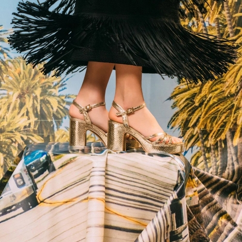 Sandalia de tacón Britt Mustang para mujer, diseñada en color champagne con textura de estilo piel de serpiente. Incorpora un set de tiras en el empeine y otra rodeando el tobillo acabada en cierre de hebilla para mayor comodidad. Deslumbrarás en cada pisada.
