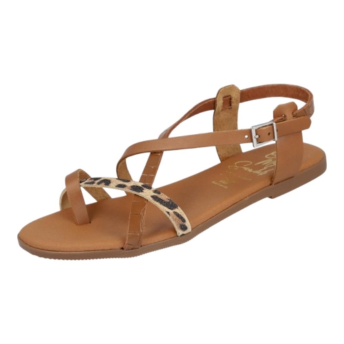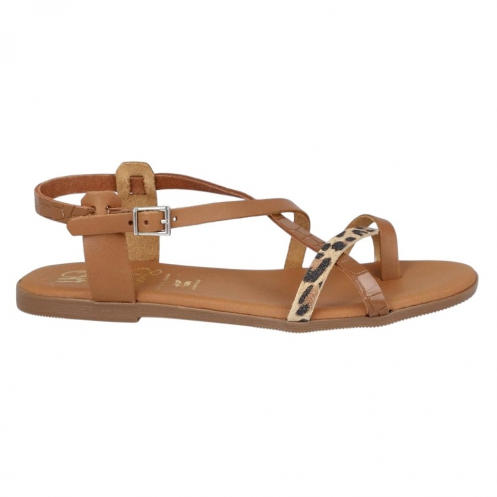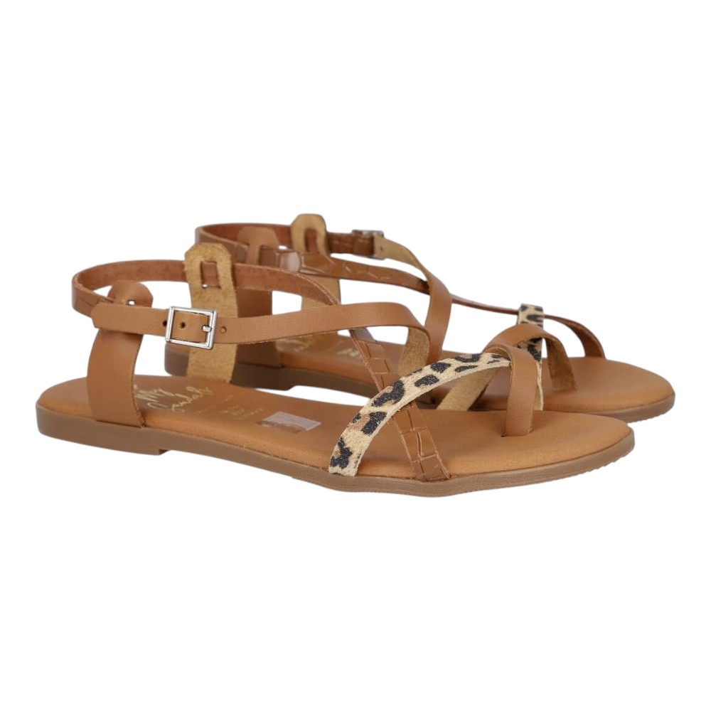 Fabricadas en España con materiales de alta calidad, estas sandalias presentan tiras finas de piel en un tono marrón claro (Roble CB) que se entrelazan delicadamente sobre el empeine. Uno de los detalles más llamativos es la tira con estampado de animal print (leopardo) que añade un toque moderno y audaz, perfecto para realzar cualquier conjunto.