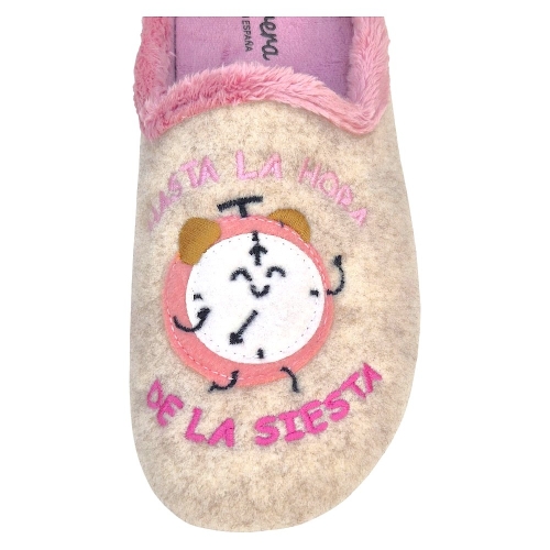 Pantufla derecha: Un simpático reloj despertador con la frase "HASTA LA HORA DE LA SIESTA".