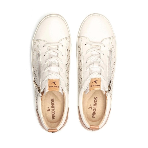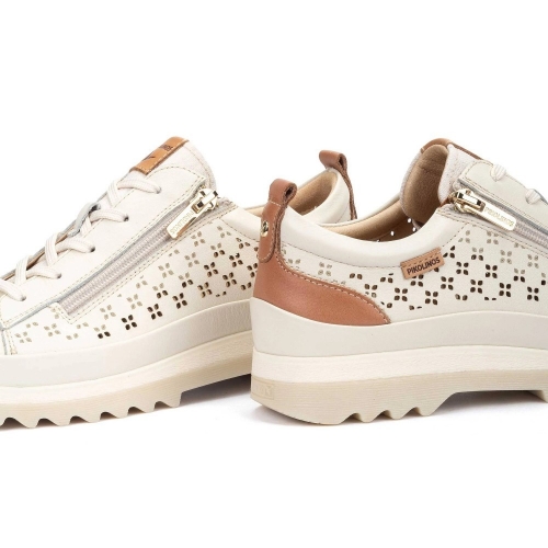 Fabricadas en 100% piel de vacuno de alta calidad, estas zapatillas presentan un exquisito detalle de perforaciones laterales en forma de flor, que no solo aportan un toque femenino y artesanal, sino que mejoran la transpirabilidad del pie. El contraste con el refuerzo de cuero en el talón añade esa identidad visual única de Pikolinos.