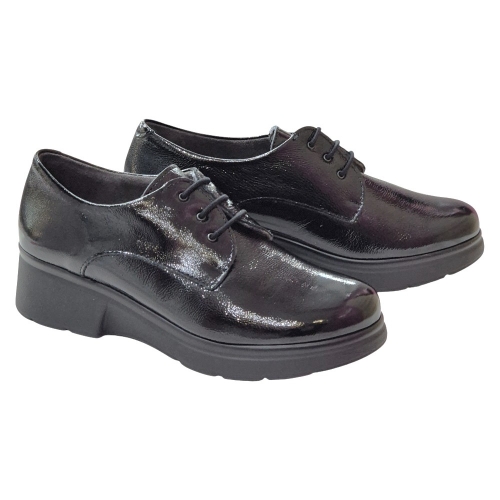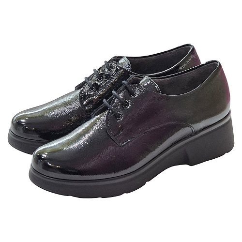 Los zapatos Blucher 10756 destacan por su acabado sofisticado en piel de charol negro de alta calidad, que proporciona un brillo espectacular y una presencia ideal para looks formales, de oficina, o outfits casuales con un toque chic.